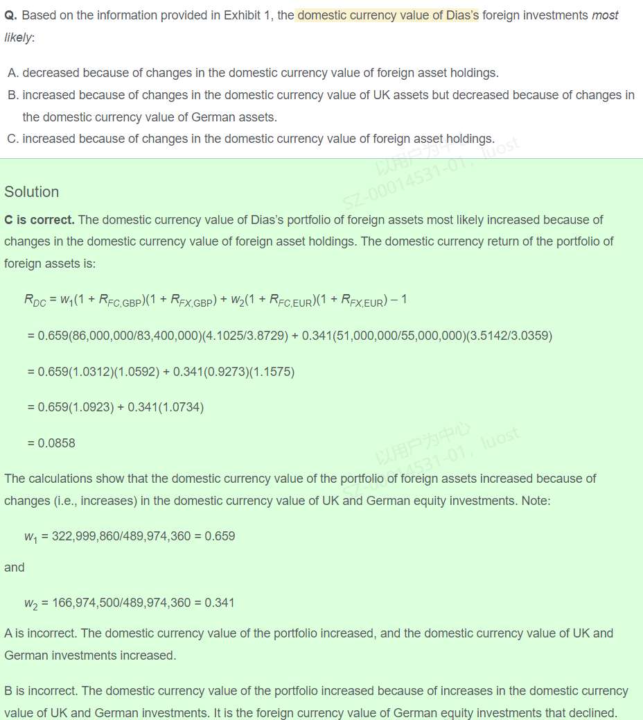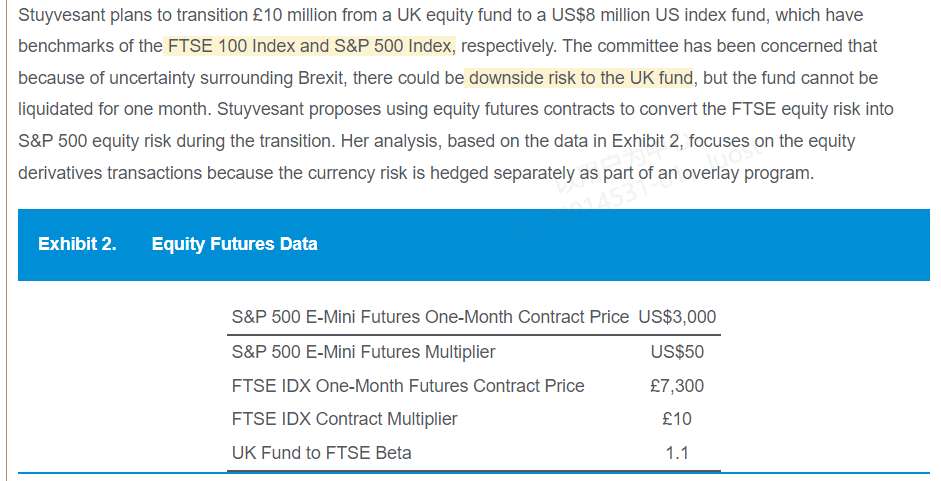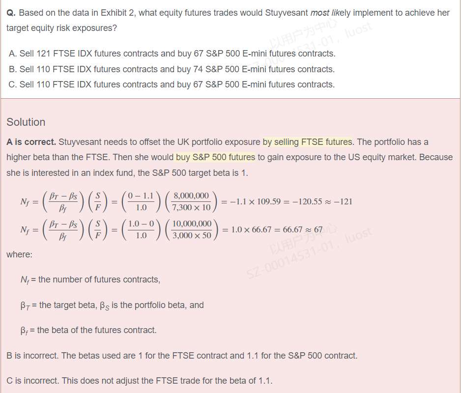 老师:1) 这题有问题吧,第一步首先应该是将1.1的beta降至0,即要卖FTSE futures(对应UK equity),不应该是用10 miilion/(7300*10)*(-1.1)吗?为什么是用8 million/(7300*10)?分子分母的币种都不一样呢。 第二个公式也算错了,这题应该没有正确答案吧 2)为什么futures的beta就是1了,题目也没说