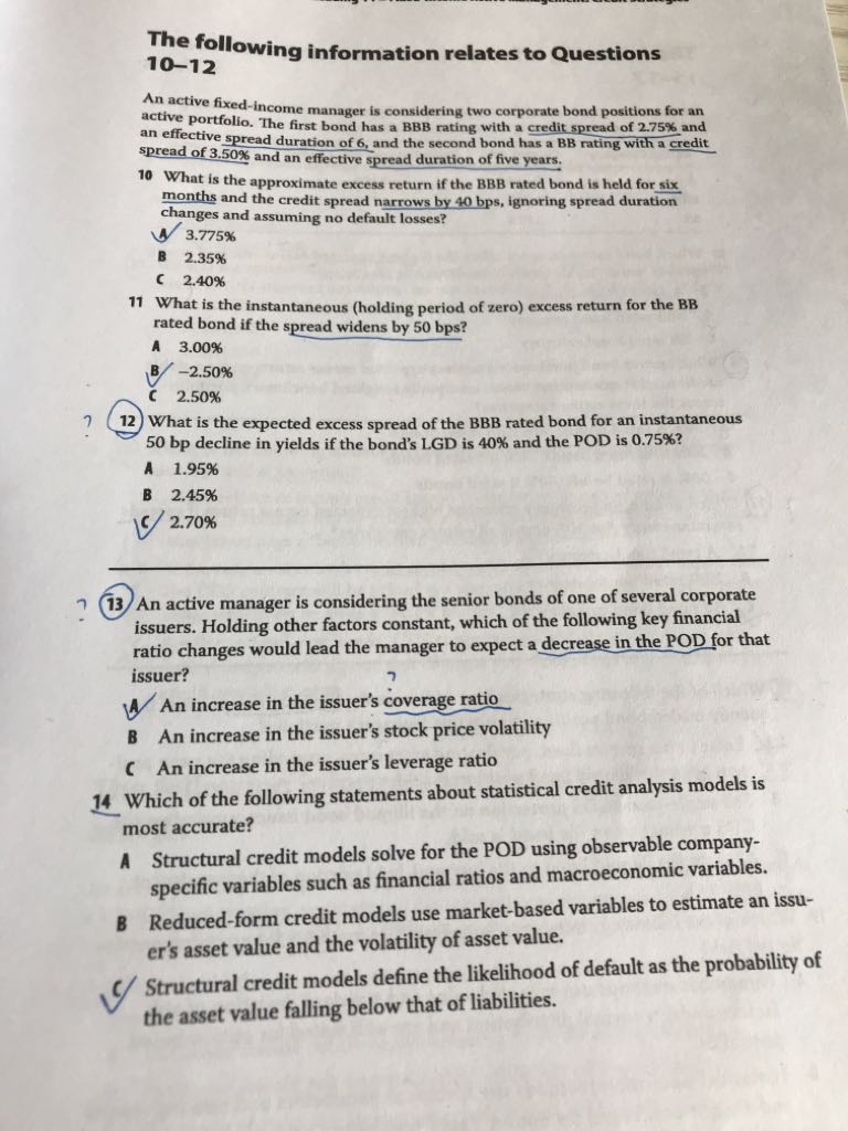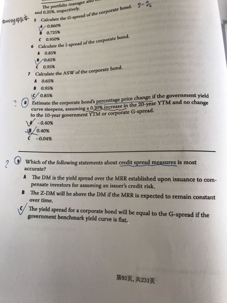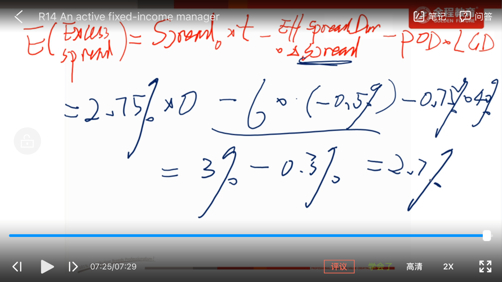 在R11债券收益分解部分关于credit spread的计算老师和书上的解法不同,老师的讲解时直接用spread的变化量,比如他给的例题中的-0.1%直接相加,而树上的答案时用MD与convexity那个公式计算,这样两种方法只算结果差异比较大,老师这个解法似乎是老答案,需要更正。另外书上也不再提用PD乘以LGD来算credit spread这个概念了。