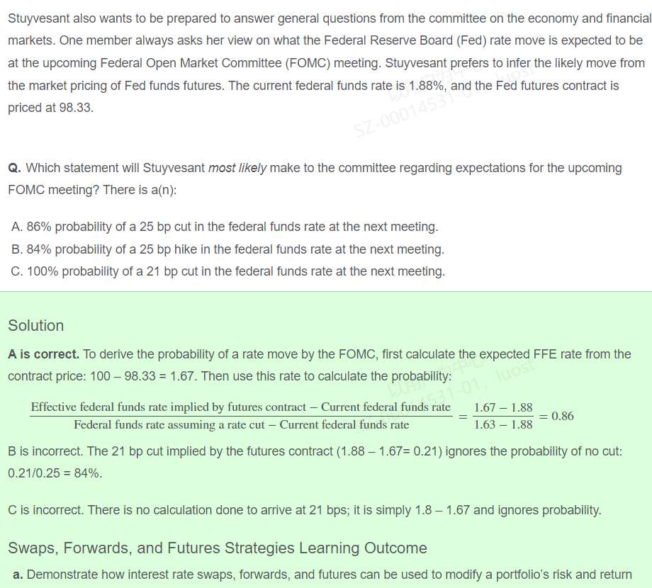 老师,这一题也有问题吧?根据这数据计算出来是84啊?不是86,这里头应该没有一个正确答案吧?应该是84% probability of a 25 bp cut in the federal funds rate at the next meeting. 另外,官网题感觉好多错误啊!!!很耽误复习时间呢,金程能否出一个题目有错的官网题汇总啊