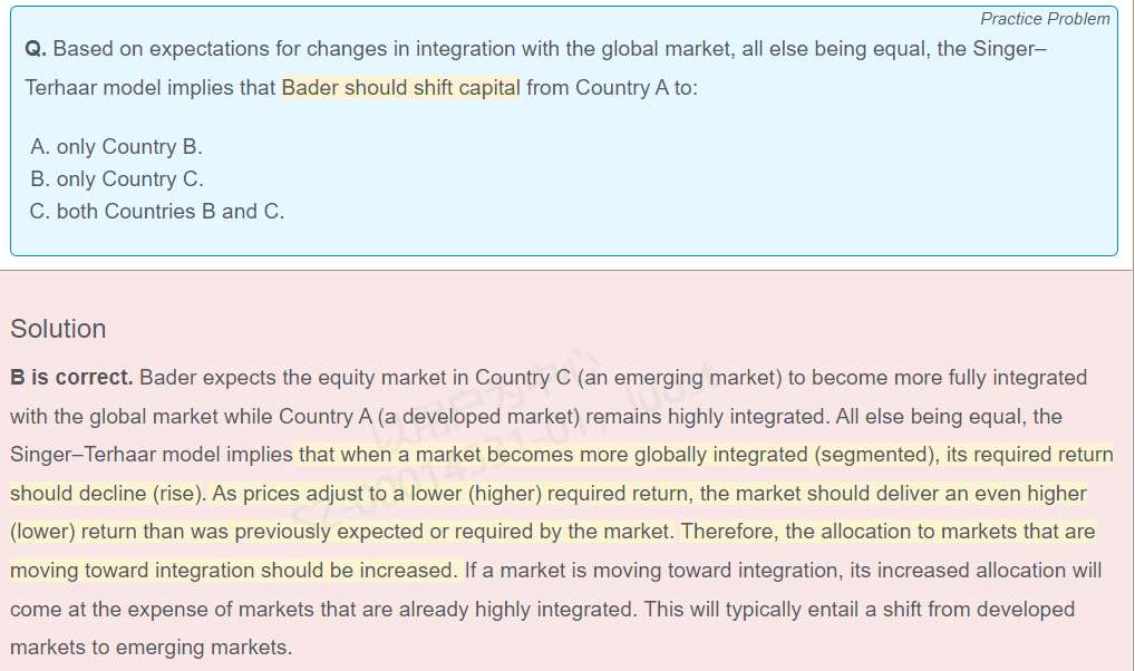 老师,这题不懂,为什么country C的integrated程度更高,要求回报率就低了,然后就选它了?