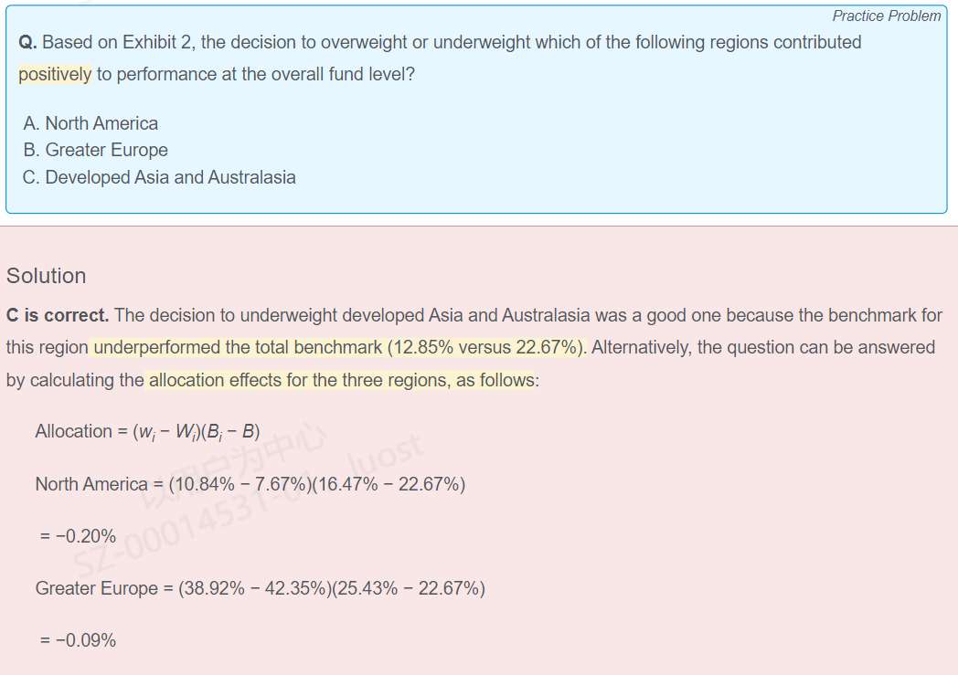 老师,1)这题为什么是计算asset allocation 而不是计算security selection呢?2)什么样情况下才是计算security selection?能否以该题作为example举是计算security selection的问题例子