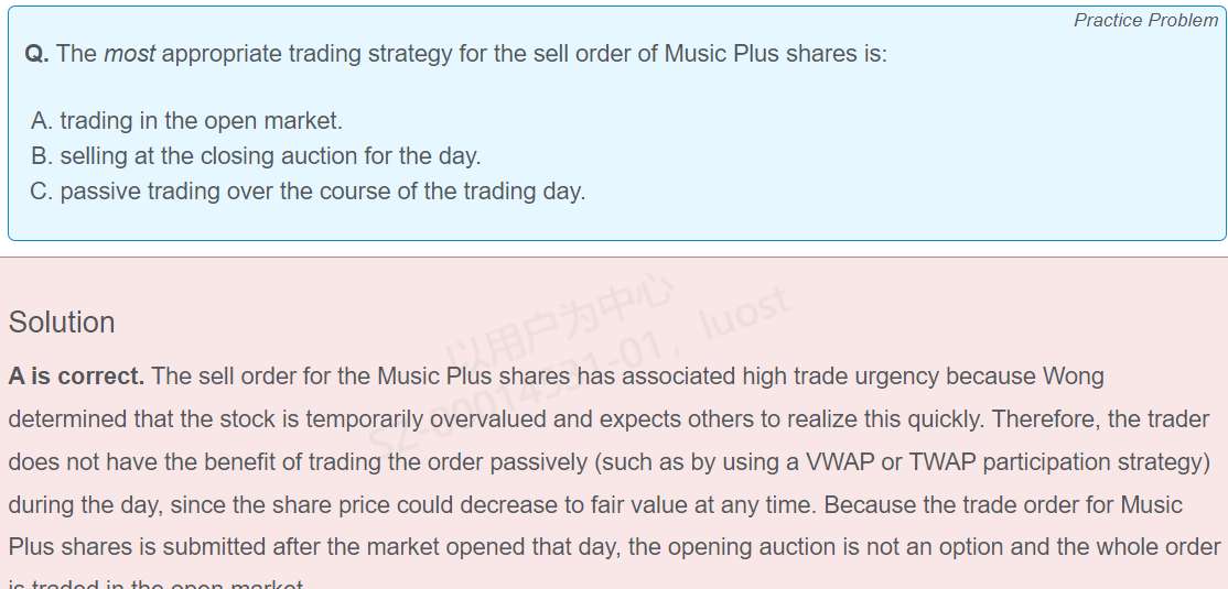 老师,题目说is concerned about information leakage from a public limit order,那1)选A在public 市场交易不会有影响吗?2)可以理解A应该是3个里头的最优选项,但如果选项中有dark pool的话是不是就不选A而应该选dark pool了?