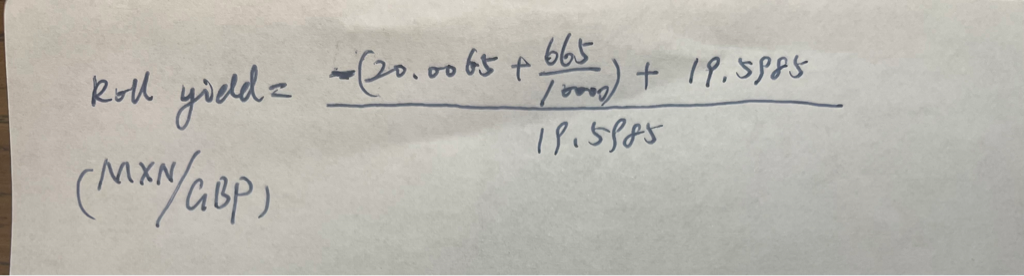 老师您好 reading10 example5 第三小问roll yield 具体计算是怎么样的啊,选取哪些数据,我的思路是这样的,先用今天的现货空头(gbp)平了原先的两个月的多头gbp远期 然后再新开一个月到期的多头gbp远期 我图里的数据选择正确吗,望解答,谢谢老师