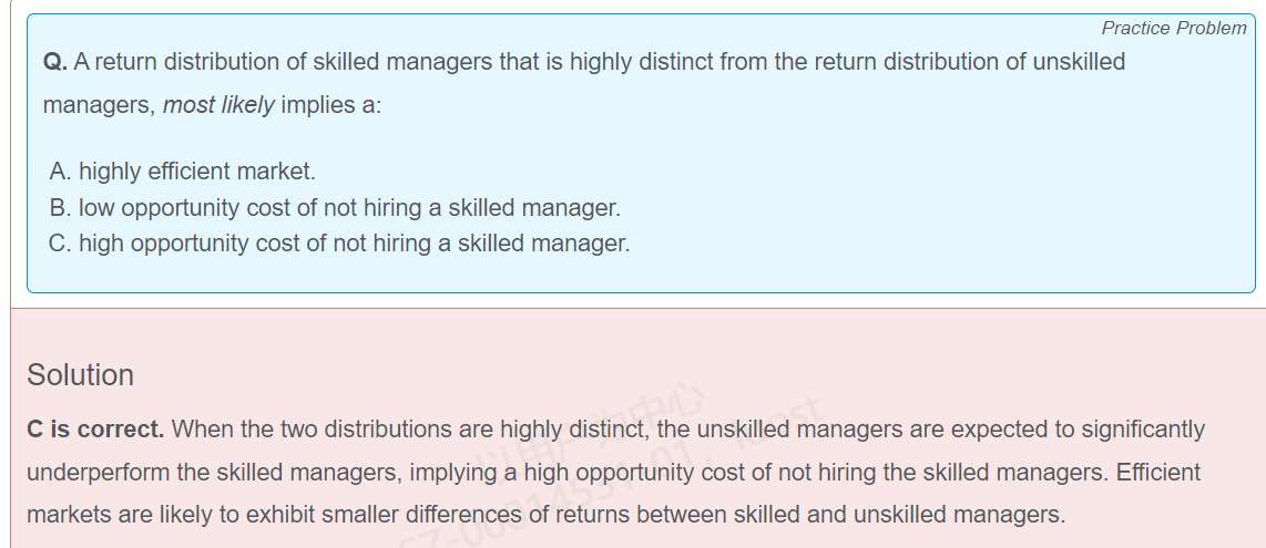 已回答老师,这里如果是问犯错误的概率的话,是不是就是更低、更不容易犯一类/二类错误了?因为分部的差异大? 但本题问的是机会成本的高低,由于分布的差异大,所以不雇用skilled manager的成本就更高了? 以上理解正确吗?