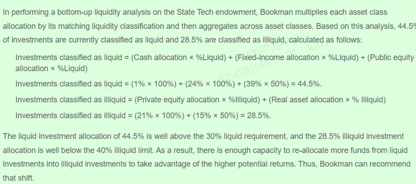 Investments classified as liquid = (1% × 100%) + (24% × 100%) + (39% × 50%) = 44.5%老师,为什么计算liquid部分的时候不用算上RE (15%*50%=7.5%)?RE也有50%的semi-liquid啊