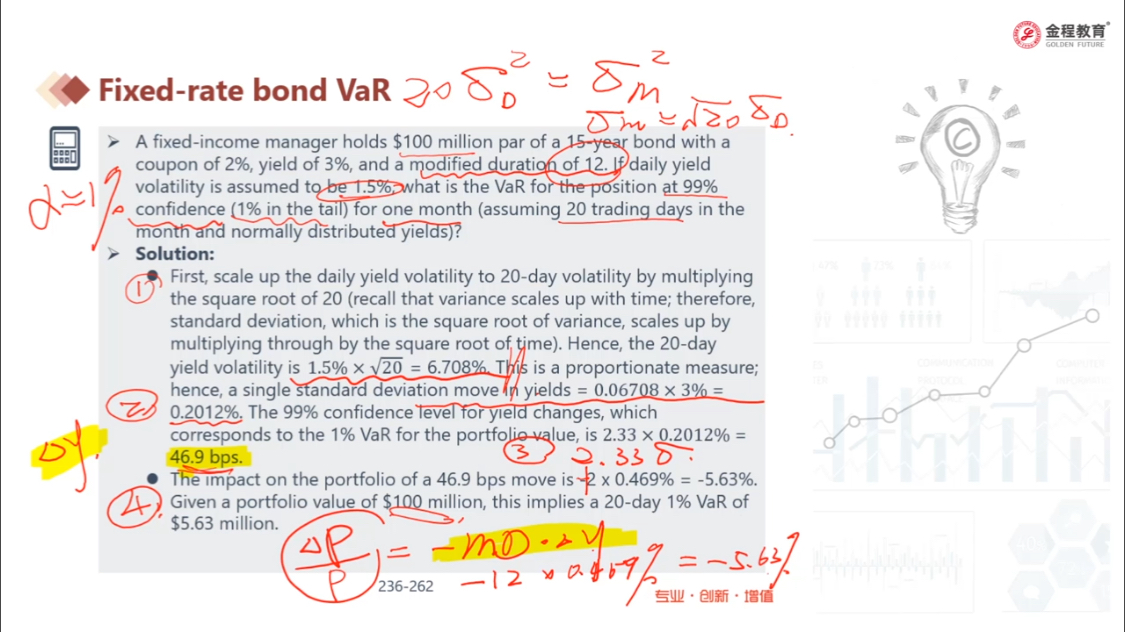 计算的20天的yield volatility是1.5%*根号20,为啥还要处以100,yield的month sd不就应当是6.7%吗?然后当显著性=1%时,乘以2.33,就是偏离yield 均值3%的距离15.63%,因此当duration=12时,delta P/P = -12*15.63% = -1.875,这意味为VaR = 187.5millon,这是没意义的吧,因为我long的债券,最多就是亏100million呀?