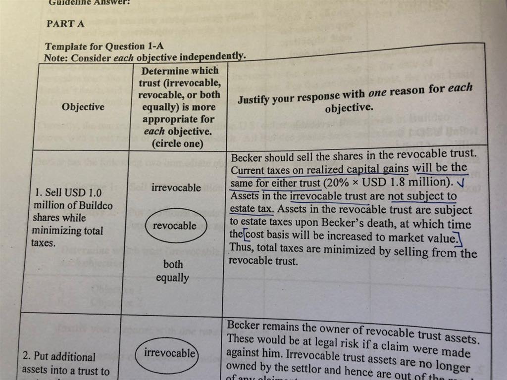 已解决老师好,请问个人IPS 2011年真题A,这里两种trust的capital gains tax一样,没问题,但是irrevocable trust不用交财产税,不是total tax更少吗?比如说卖出了股票交了税后剩下1.6million cash在trust里面,revocable最后还要交财产税,irrevocable不用交财产税了,那total tax不是更少吗?