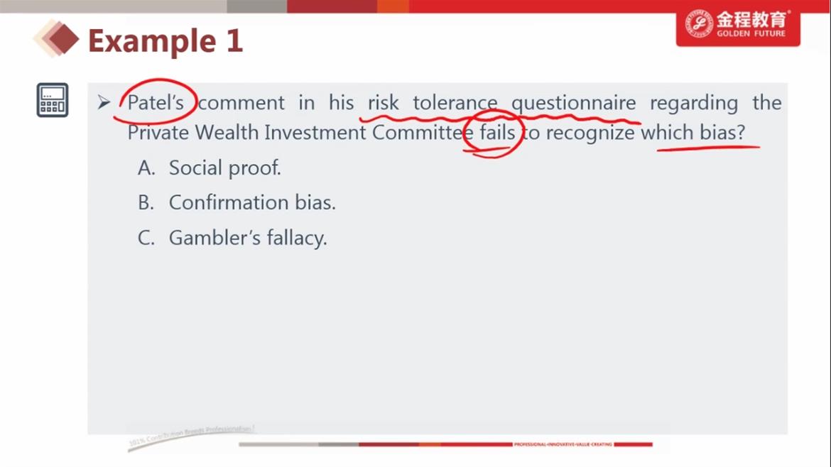 这里第六题我个人理解讲解是有问题的,老师讲的是没有体现social proof这种偏差,实际上问的应该是patel没有意识到committee会犯什么错误,实际上是问committee会犯什么错,这在后面答案讲解也说的committee may wrongly favor the judgement of others,我认为讲解产生了误导。