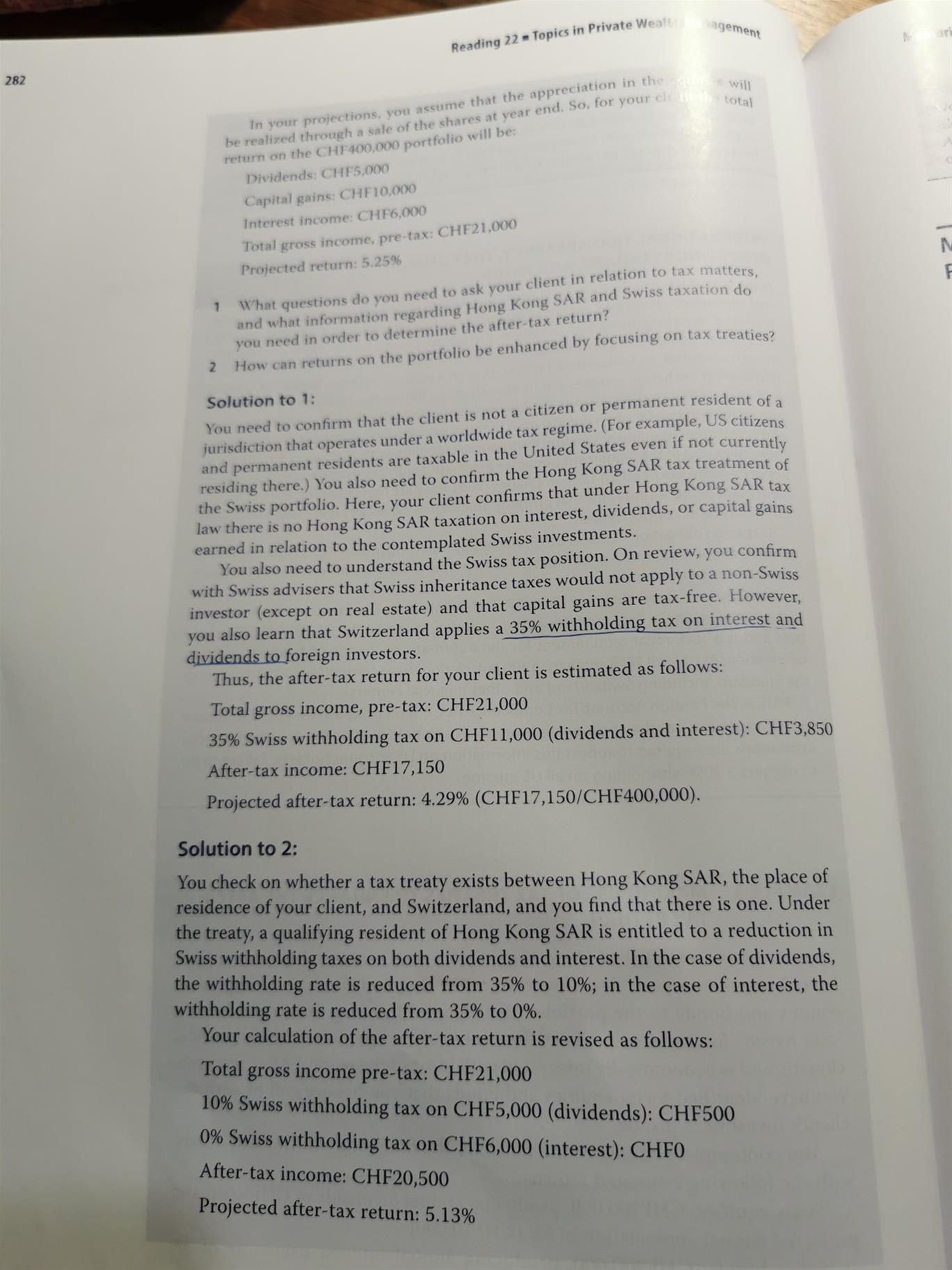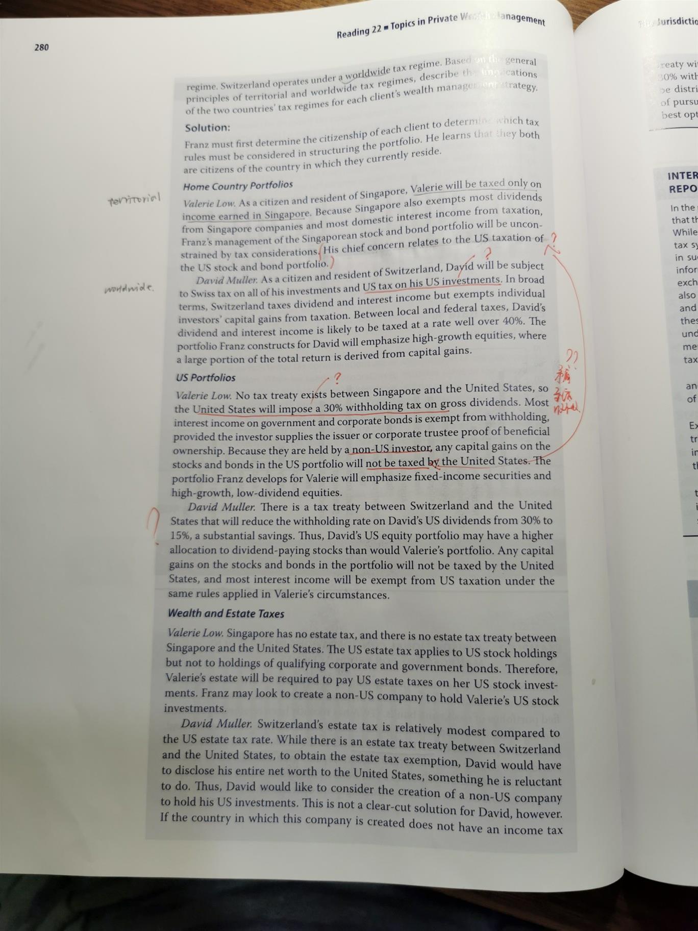 老师,R22例题2的解析看得很不懂:nn1. 关于home portfolio, Low是territorial tax,那不就是只是对他在新加坡的收入进行征税吗?为什么第一段最后一句说主要考虑他在美国股票和债券的美国税?nn2. 且还说新加坡一般对dividend和国内利息免征税,所以股票和债券不受税收影响。--债券我可以理解,但股票不是还有capital gains可以征税吗?nn3. home portfolio关于Muller,为什么home portfolio里要说到对美国投资征税的问题,这不是在US portfolio才应该讲的吗?nn后面讲US portfolio的部分和前面讲的又感觉是矛盾的,求详细讲解😭😭😭n