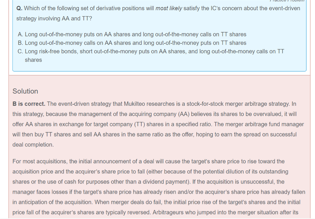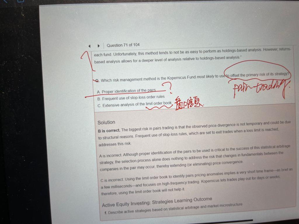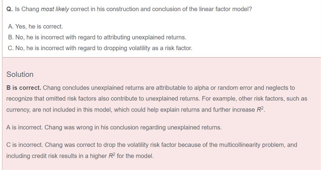 老师,这道题感觉B选项是硬要说它错,我怎么觉得一般来讲,设定好了几个factor之后, unexplained returns 就是由alpha或random error 贡献呢? 另外,C选项,意思是要区分linear factor model和conditonal factor risk model哇?按照后一个模型解释,不是应该扣除interest rate risk和commodity risk,?