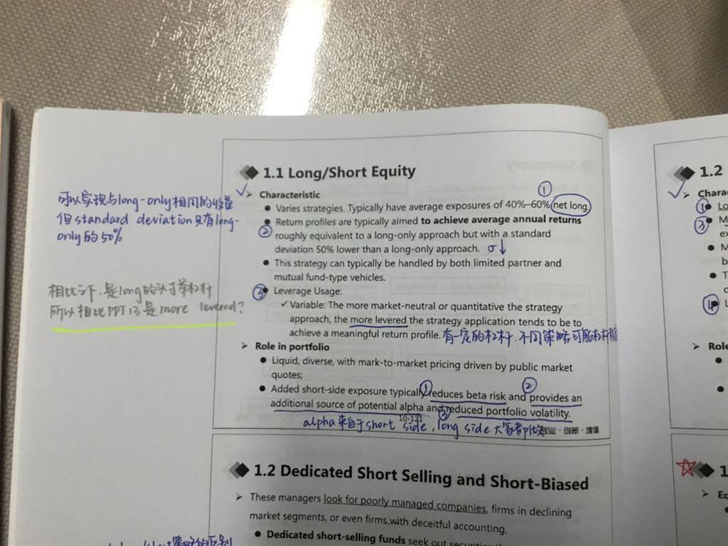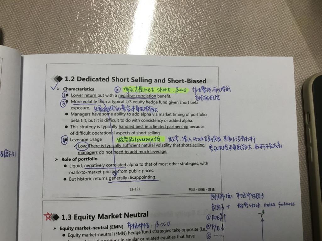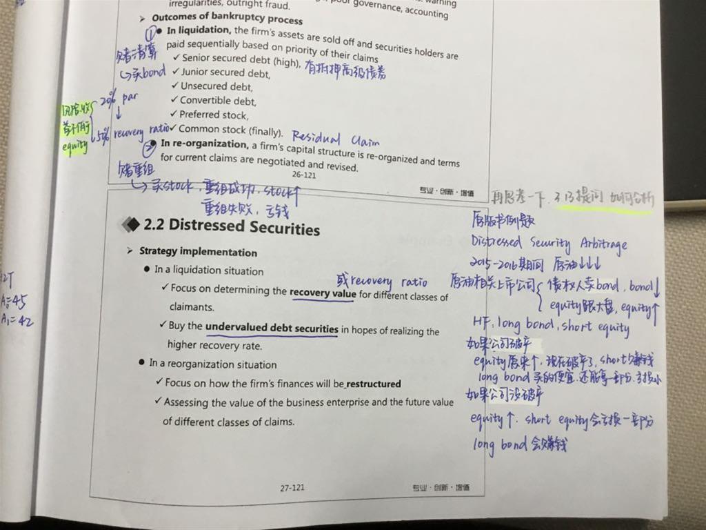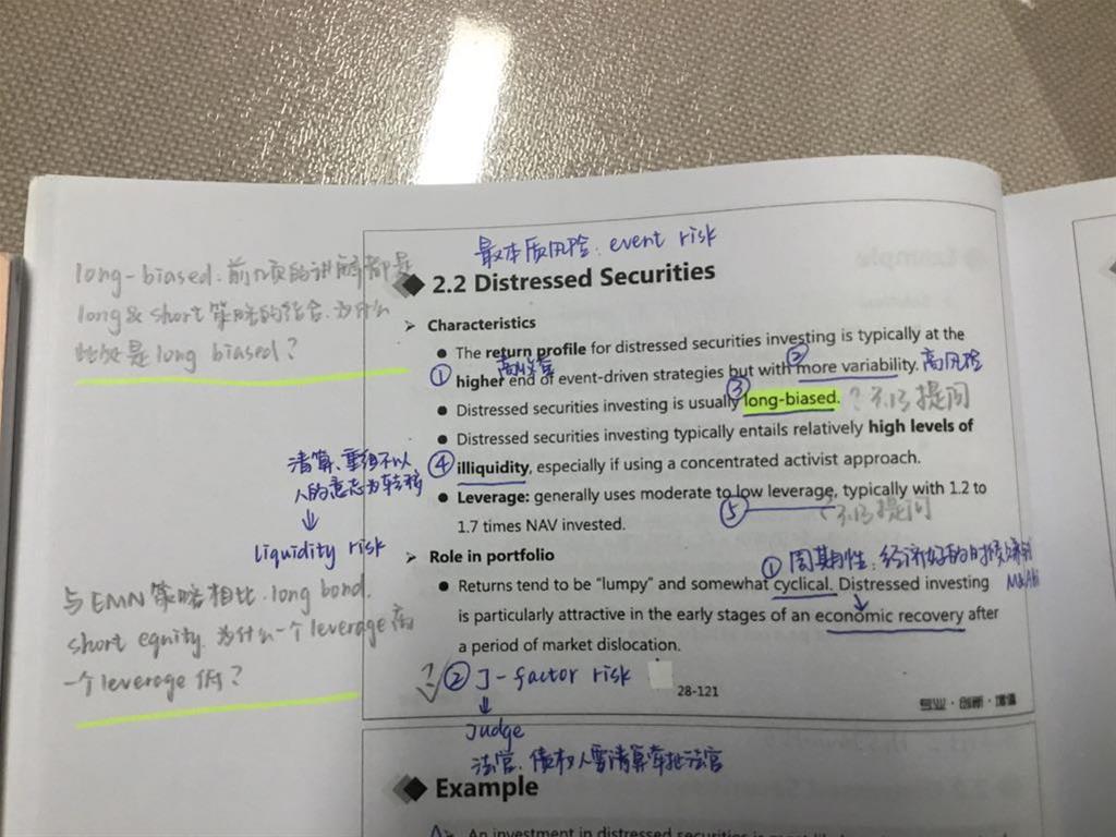 已回答jcy老师另类讲义28页,distressed securities策略特征有2个不理解的地方 1是这个策略都是一个long position,+一个 short position,类似long/short策略,为什么讲义说是long biased? 2是与EMN策略相比,EMN策略是高杠杆,而distressed securities 是高杠杆,为什么呢?我理解如果DS策略把beta降为0,跟EMN策略是一样的?