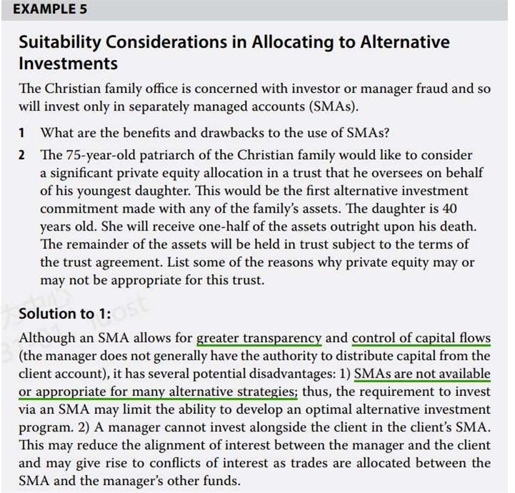 老师,原版书R20例题5,问SMA的缺点有哪些,第一个说SMA不适合alternatives投资,为什么不适合呢?基础班好像没讲到;第二个缺点也没看懂,请老师讲一下;此外,缺点如果写SMA的cost高可不可以?