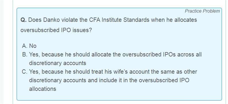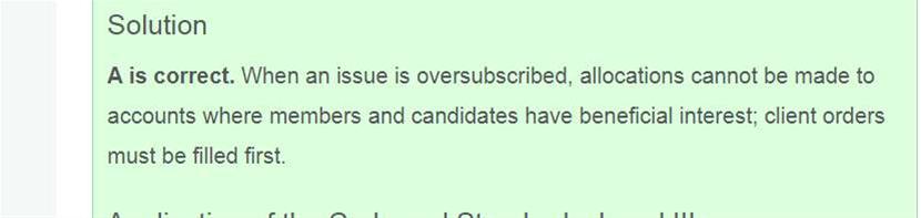 老师好 ,这道题是不是答案不对?首先 他妻子的不付费账户视同自己的账户,那么 我理解的在发生认购的 时候是不是应该先客户再自己,超额认购 的时候除去自己账户? 其次第二点,如果我 前面理解的对的话,那么这道题 是不是因为原文里面未说认购的顺序所以不能 想当然的认为违规,所以这道题选A,如果原文说认购的时候“公平”的分配给客户和自己账户,是不是就违规了?