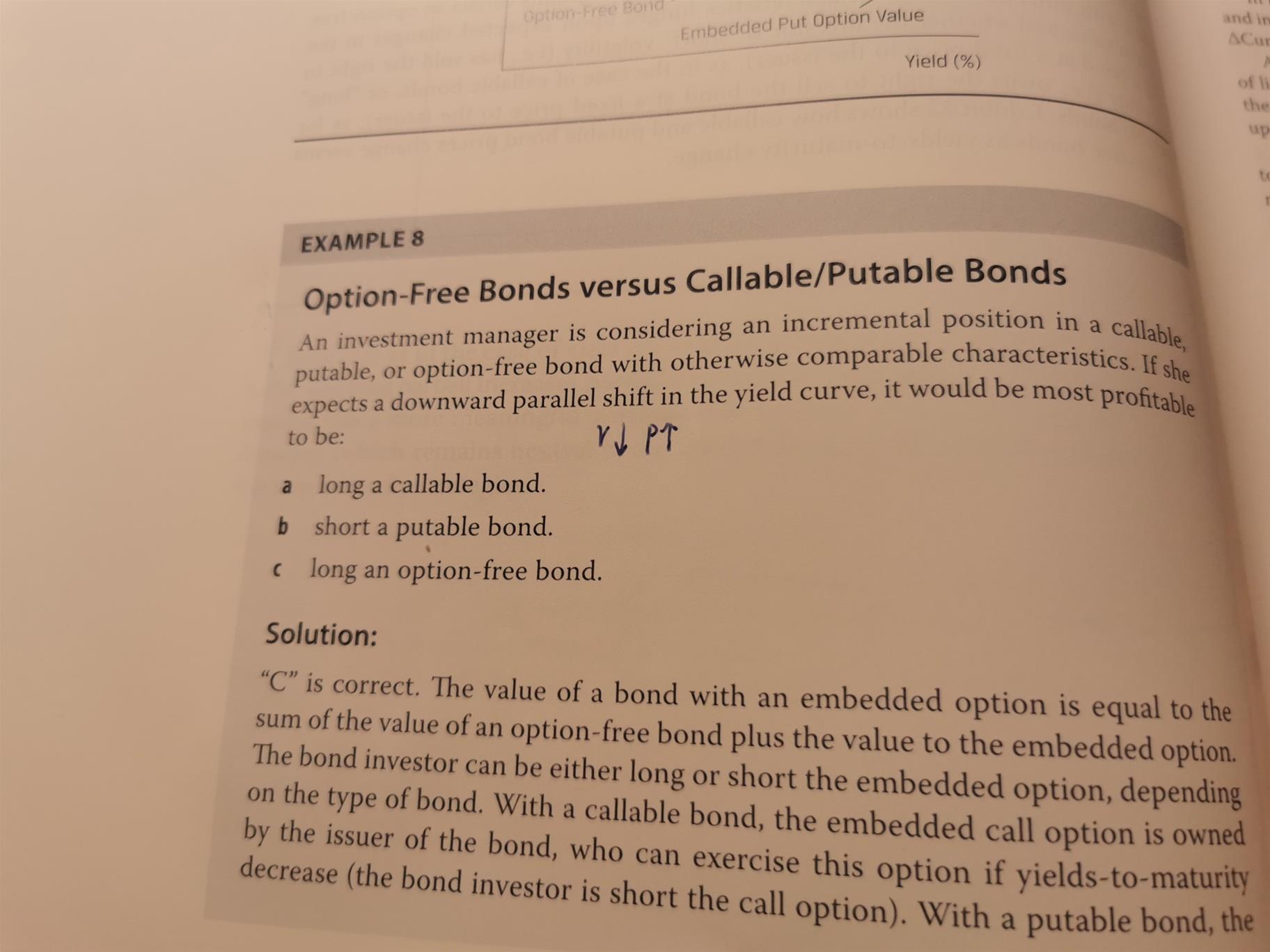 已回答老师,R13例题8看得一知半解,可以具体讲讲为什么选C吗?nn利率下降,价格上升,issuer会倾向于是行call option,所以callable bond对于投资者来说表现不佳;而putable bond会倾向于不行put option的权利,对投资者来说也不利,所以就选C吗?我的理解对吗?