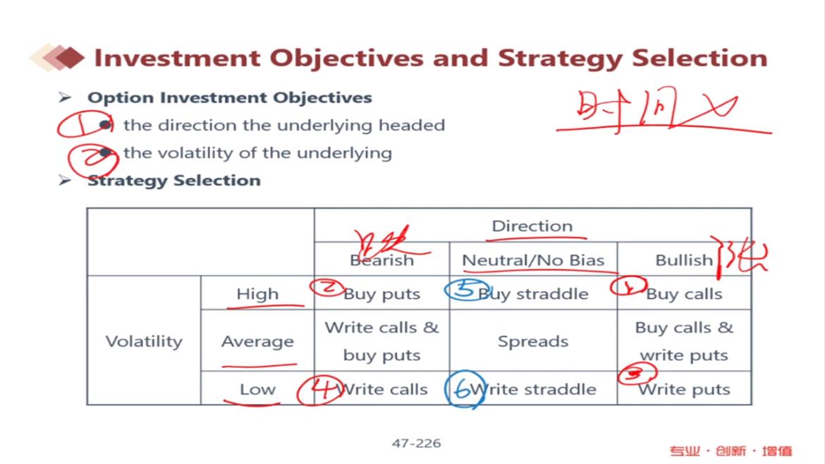 就是说,在明确牛、熊趋势,且波动不大的情况下,应该卖出期权,赚期权费;如果波动大,就应该果断做趋势投资,顺势而为。这边只讲了结果,那么原因是什么呢?包括波动中性的时候,为啥用合成的short for ward或者long forward呢?实在不理解得出这个结论的逻辑。冲刺笔记上中间的是calendar spread,跟bull spread和bear spread也无关,既然都能判断出bull和bear了,为什么不能用7、8的策略呢?