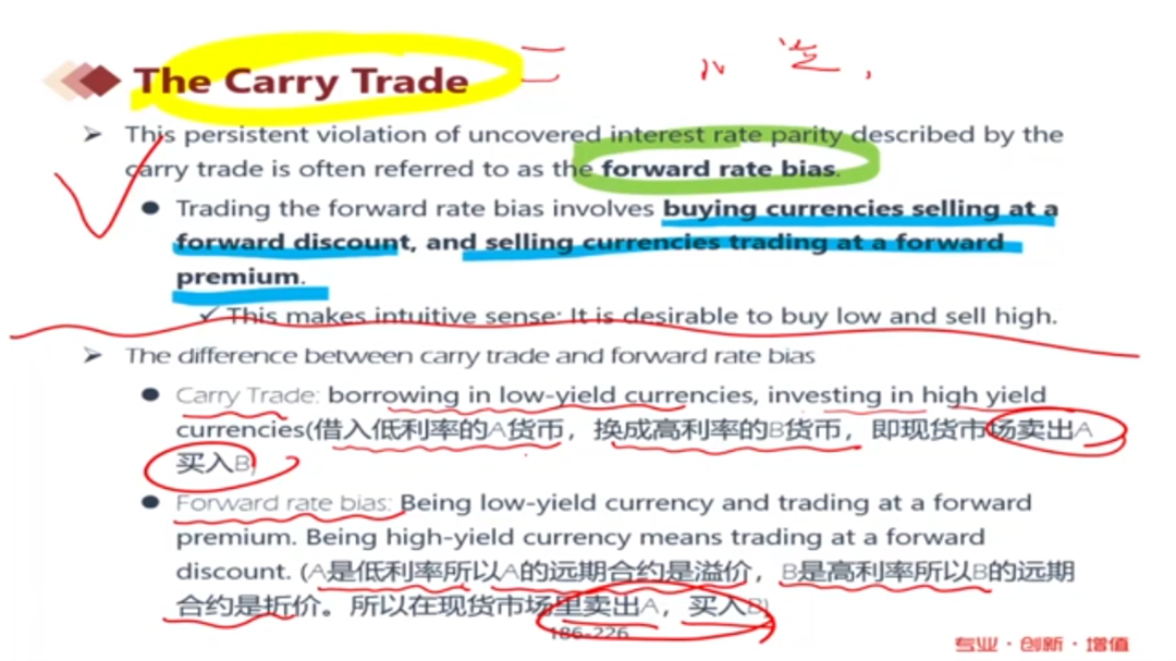 已解决洪超老师开始说Carry trade 执行的前提是IRP短期不成立。 后面又讲,借入低利率(做空A),买入高利率(做多B),但根据IRP,A远期会升值,B会贬值。则到期时,利差部分和汇率贬值部分完全对冲了,则如何实现carry trade呢? 这里的逻辑前前后后没有理清楚