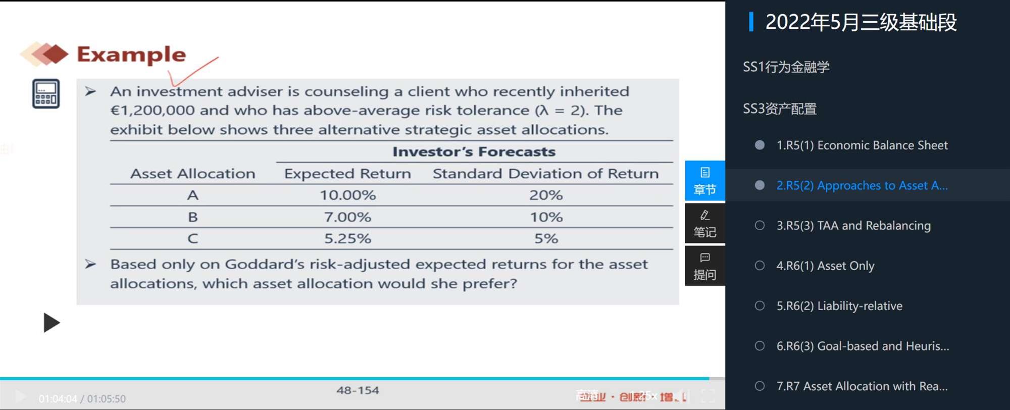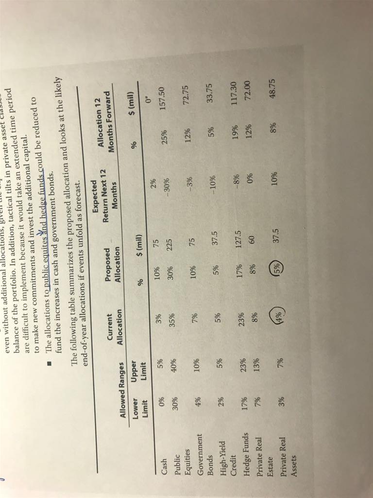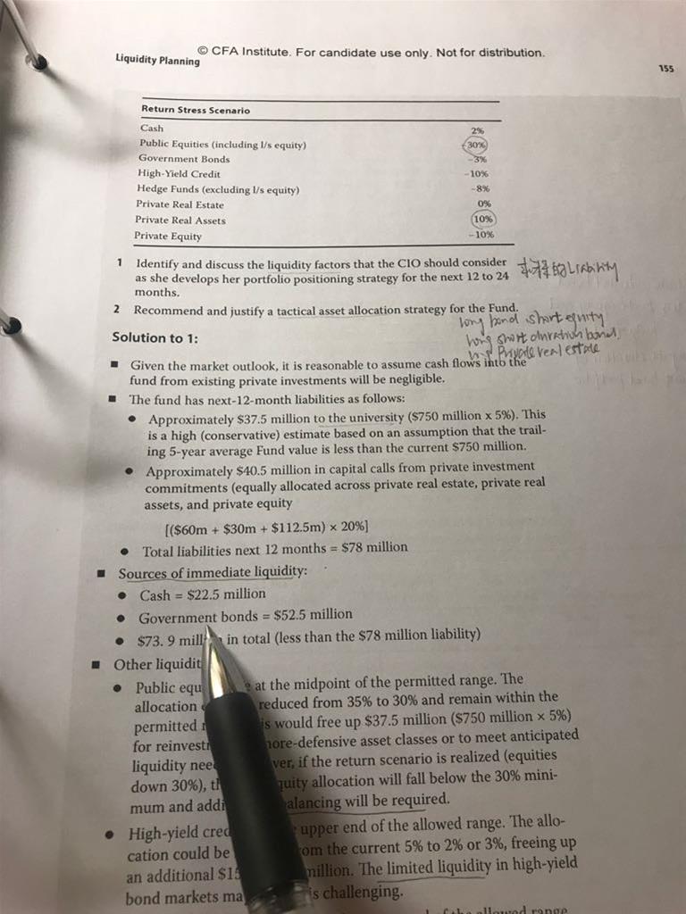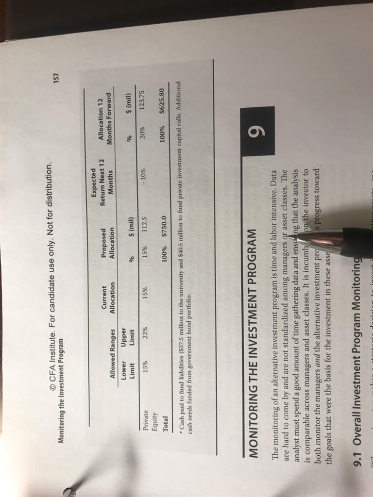 已回答reading27 example9 solution2:(1)为什么government bond allocation 12months forward的比例是12%,这个高于了upper limit。(2)为什么PE allocation 12months forward的比例是20%。 expected return next 12month是负数,还要增加投资比例吗?
