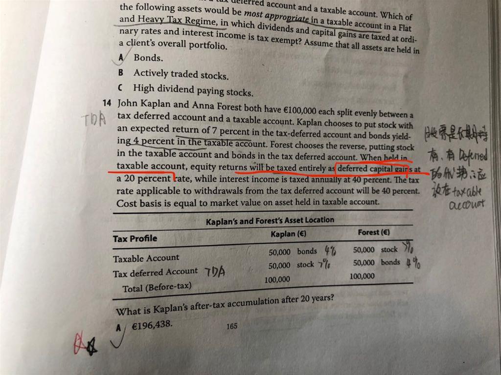 老师您好,stock在taxable 账户里面,但是他又说了equity returns will be taxed entirely as deferred capital gains at 20%,所以我是用taxable account来算还是用deferred capital gains来算呢?谢谢