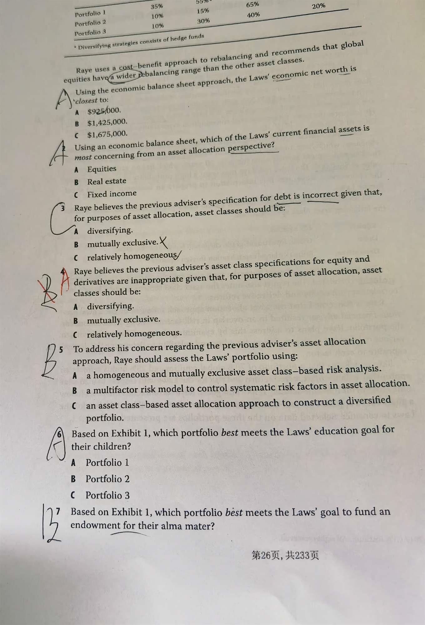 题目里说 第一个资产类别和第三个资产类别 有较高的相关性那么 C 选项为什么不行,不是每个资产大类直接要互斥,同一个资产类别里面是同质化。 整个组合要分散。 A 也可以适用这题,但不明白C 错在哪里,感觉这题C 更合适