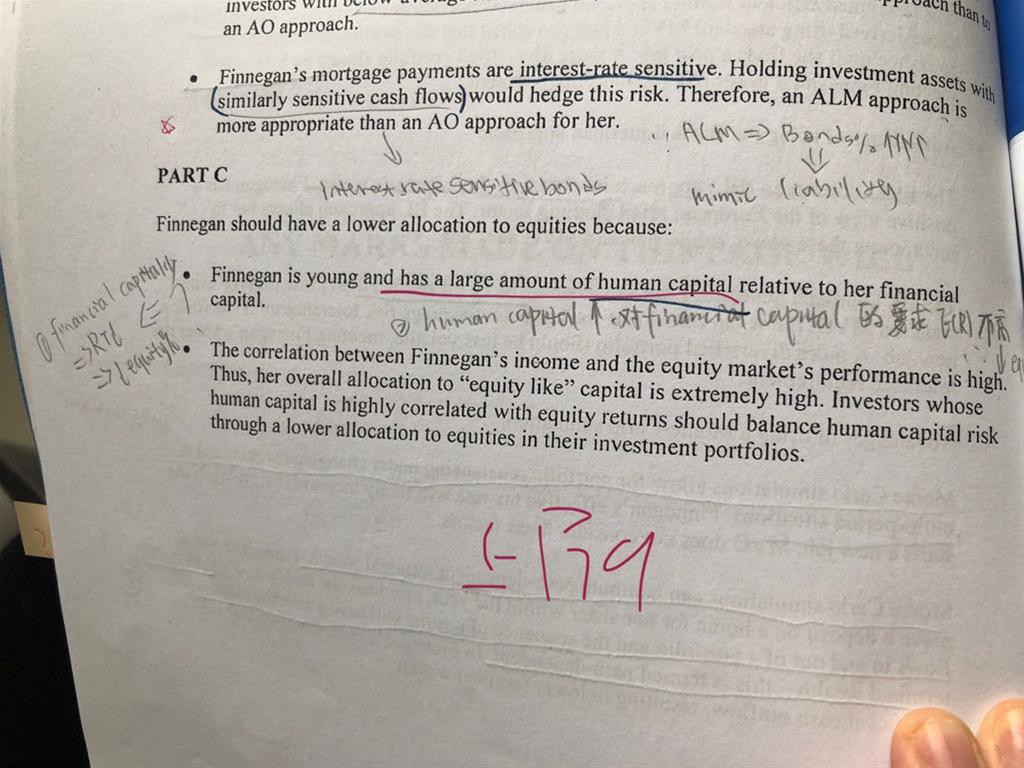 已回答老师您好,这道题答案是按照Human capital高的角度答的,而我是按照human capital变低的角度答的。我是这样写的。C. Because Finnegan expects that her work still is highly correlated with equity market returns, her human capital is subject to higher discount rate and her human capital is less. Lower allocation of equities in financial account can decrease the risks associated with human capital. In addition, because Finnegan has not found a new job, her human capital currently is less and she has lower ability to take risk. Lower allocation to equities can be consistent with her lower risk tolerance.能帮我看看我说错了吗,错在哪里呢?谢谢