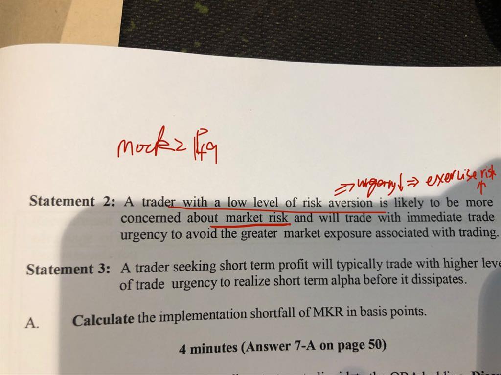已回答老师您好,我之前一直把market risk和market exposure当作exercise risk,low level of risk aversion, urgency低,market risk大,我觉得这句话是对的,我这种思路怎么错了呢?谢谢