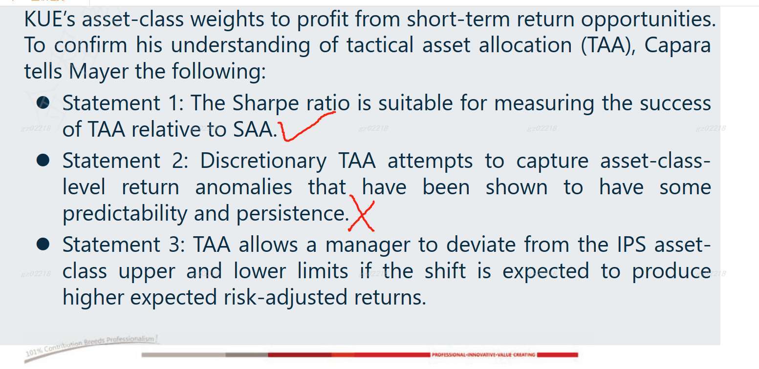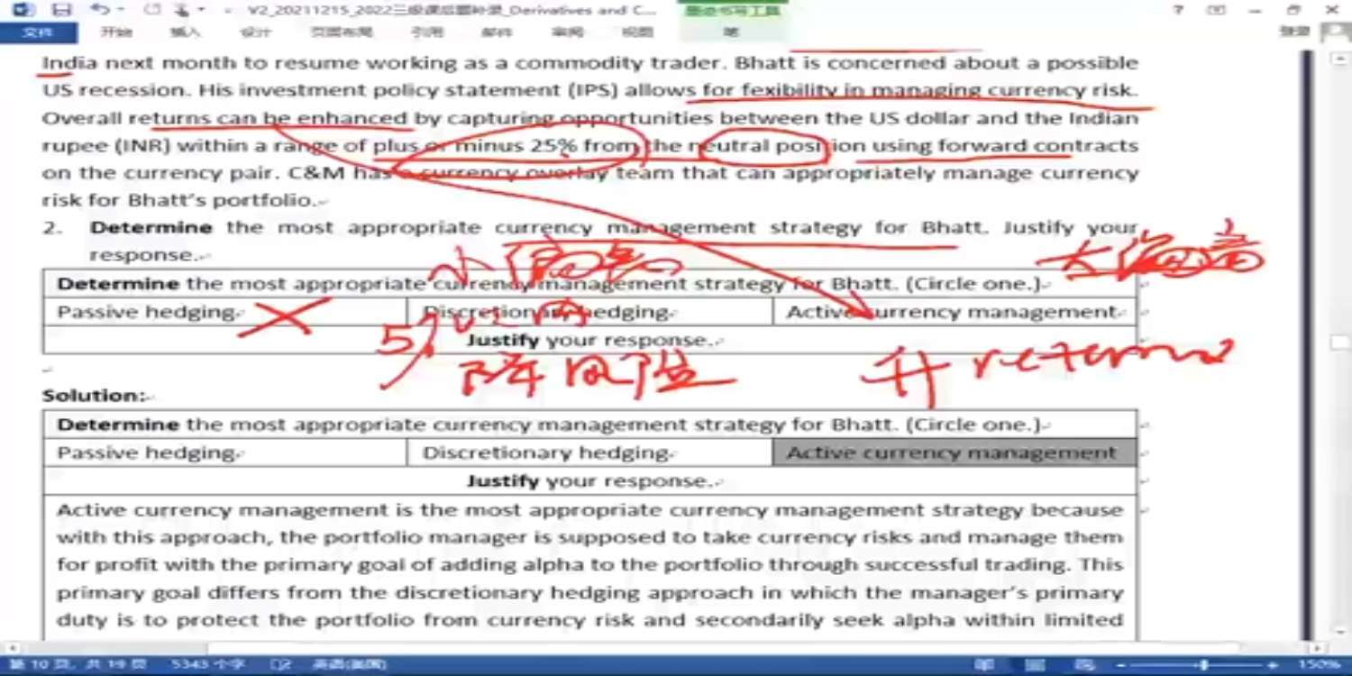 老师,第二问最后答案给的描述,关于discretionary的方法,seeking alpha within limited bound... 这个表述是否过于激进。。。还是考试的时候也可以直接用这个描述。 冲刺笔记上关于discretionary的表述是可以有一些汇率方向性意见的空间,以提高整体投资组合的回报。