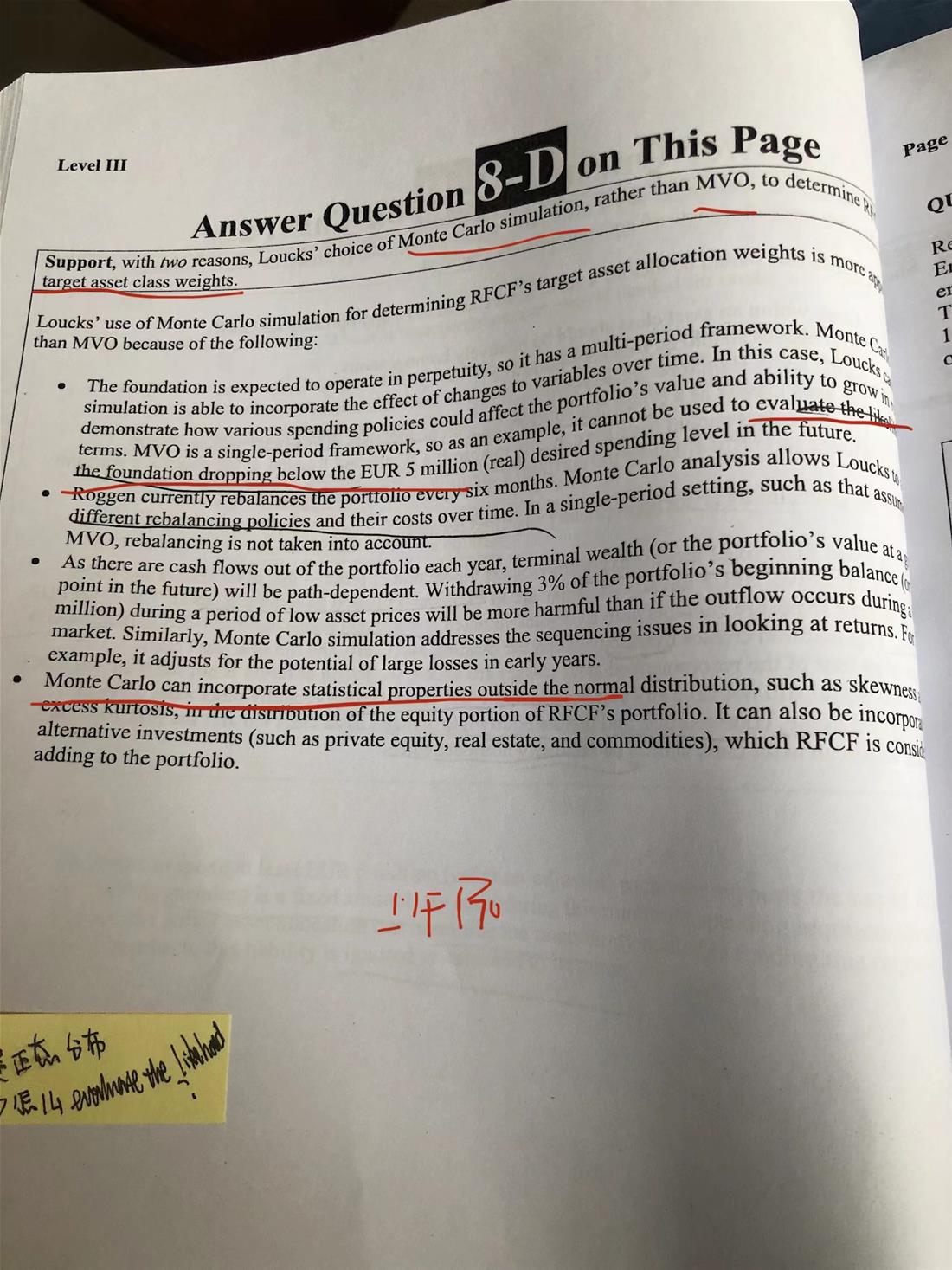 老师您好,这道题我有几个小问题, 这道题的目的是最终得到target asset allocation(哪些股票,分别是什么占比), 但是为什么这里会知道the likelihood of the foundation dropping below 5 million呢? 我知道monte carlo simulation最终得到overall probability, 但是这道题是为了得到TAA, 所以我写的是The portfolio resulted from Monte Carlo simulation is more stable and diversified.另外还想问一下MVO 的assumption是input都是normal distribution吗?谢谢