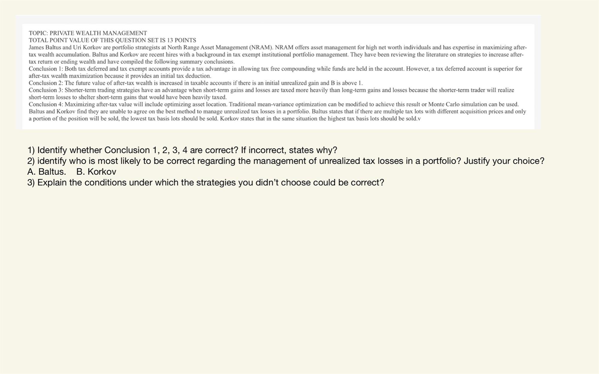 已回答老师好, 附件中的case,想请教一下: 1)4个conclusion分别如何理解,表述是正确还是错误 —我没太读明白的是conclusion 2 & 3 —关于conclusion 4,我就想确认一下,之所以说traditional MVO can be modified to achieve this result, 是不是因为传统MVO可以修正为factor-based MVO,从而实现税后收益最大化? 2)关于HIFO和tax loss harvesting,在什么情况下应该基于HIFO(high cost basis),在什么情况下又应该LIFO (lower cost basis)。