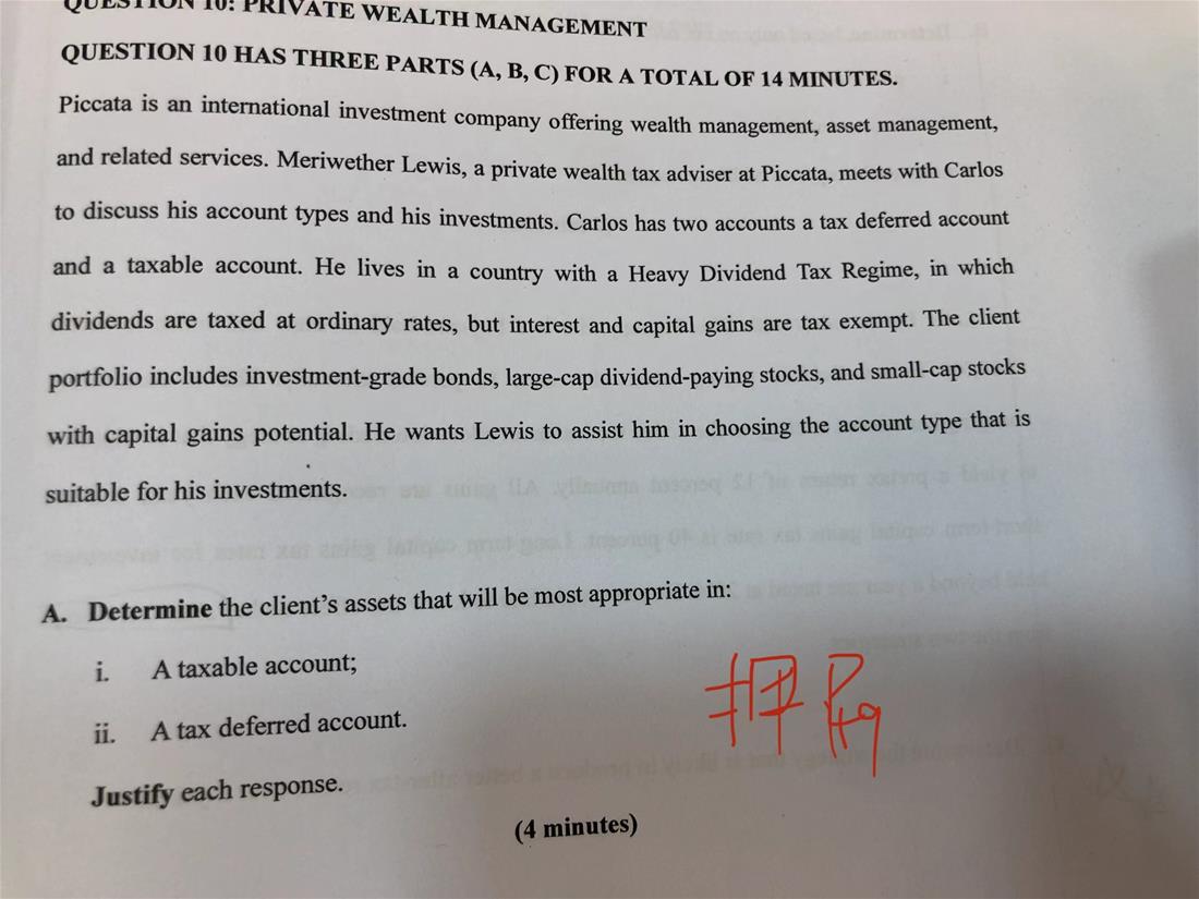 老师您好, 我想问一下这道题对dividend重税, 但是我觉得把divided-paying stock 放在taxable account or TDA, 他们对dividend收的税其实是一样的, 只是TDA 晚点收dividend的税, 所以我是这样写的If Carlos put large-cap dividend-paying stocks in his taxable account, the dividend will be taxed periodically, which can lead to lower net-of-tax amount available for investment and thus has lower future wealth accumulation. Investment-grade bonds and small-cap stocks should be allocated in Carlos’s taxable account, because interest income and capital gains are tax exempt. 请问我的想法对吗? 还有个问题是TDA会收个withdrawal的税,我想问一下我的INT, DIV, CG在的取出来的时候的税率是一样的吗?都是withdrawal 的税吗? 我知道放在TDA,是期末才交税,但是INT, DIV, CG交的税率是一样的吗? 谢谢