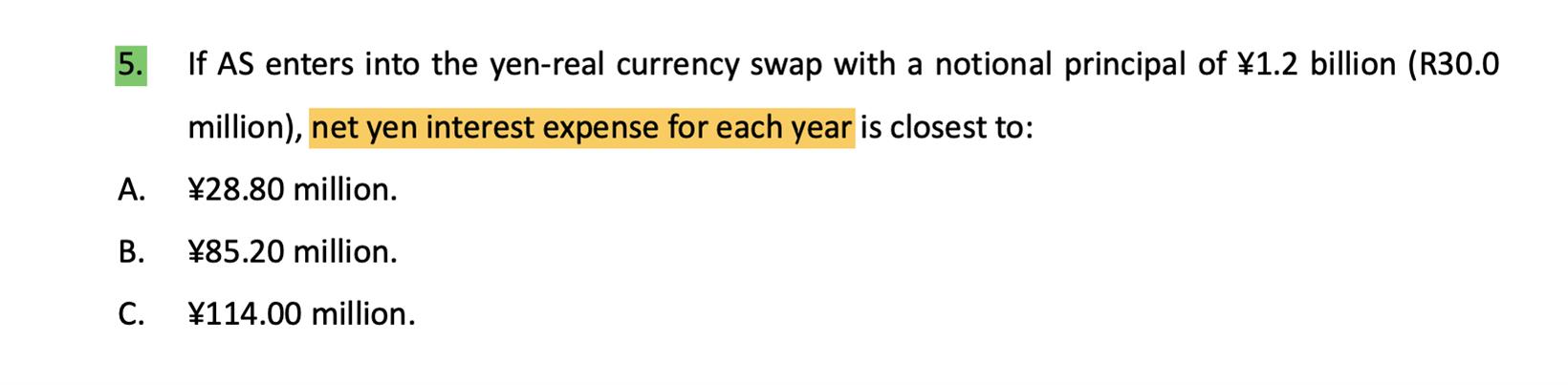 已回答百题derivative Case1 Q5 这道题答案只算了AS支付local yen的cost和收到对手方yen interest,然后求netting cost,但是AS还有支付对手方Real,为什么没有*40转成yen来求net expense呢?虽然这道题是选择题可以选对,但如果是填空题?我怎么知道要不要包括在内呢?严格来说应该要把所有能够知道的利息转成yen来算的吧。