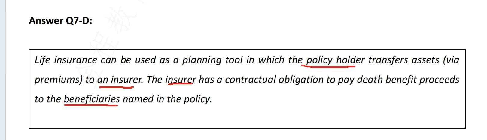 在life insurance中,policy holder、insurer、beneficiary各是什么?这个题答案中说寿险可以让policy holder把asset transfer to insurer,这俩不是同一个人吗?应该是让policy holder transfer asset to beneficiary吧