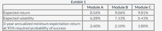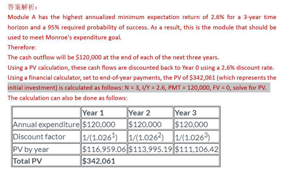 Monroe is retired and has $4.2 million of financial assets. One of Monroe's goals is to fund expected nominal expenditures of $120,000 in each of the next three years at a 95% required probability of success. Thompson suggests using a goals-based approach to construct a portfolio that meets this goal. She identifies a set of three available optimized sub-portfolio modules, as shown in Exhibit 1. She assumes that each year's expenditures will be a single year-end cash outflow.老师,为什么这题只需要考虑95%的收益,不需要考虑期望收益和波动率?这个是考哪个知识点呢?