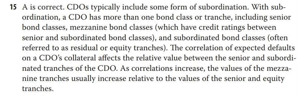 第21章课后题第15题。网课中在说到债务抵押债券(CDO)中,并未提及当高层级(senior tranche)和低层级(subordinated tranche)违约概率相关性为正或为负时,中层级(mezzanine tranche)的相对价值将会如何变动。为何说,当高层级与低层级违约债券相关性为正时,中层级的相对价值将会上升呢?谢谢!