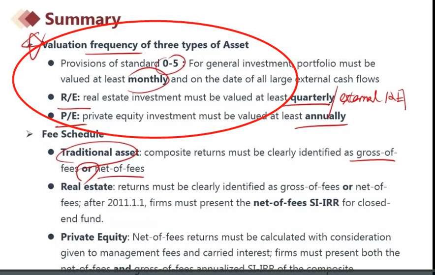 老师好。请帮我确认下一个问题,mutual fund的估值是按照“ least monthly ;all large external cash flows”,但是报送业绩是按照quarterly,对么?;而其他real estate估值和报送都是quarterly,PE fund估值和报送都是annually。都对呢?(太多了,一时估值,一时报送,我已经晕了)