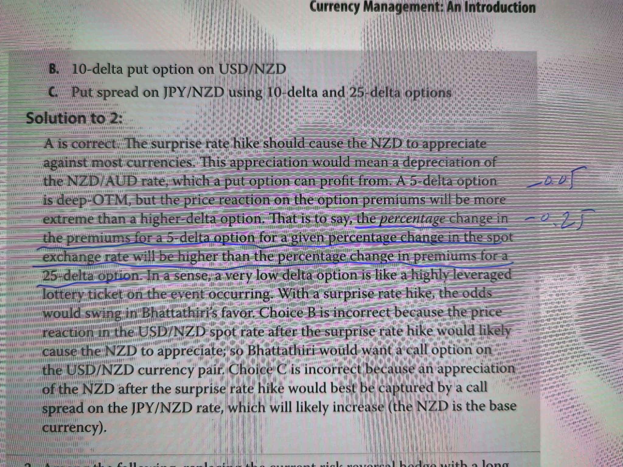 教材204页这段话怎么理解?5delta的put不是斜率更接近于零吗。25delta斜率更接近一啊。为什么说5delta的变动引起汇率变动的幅度大于25delta呢?