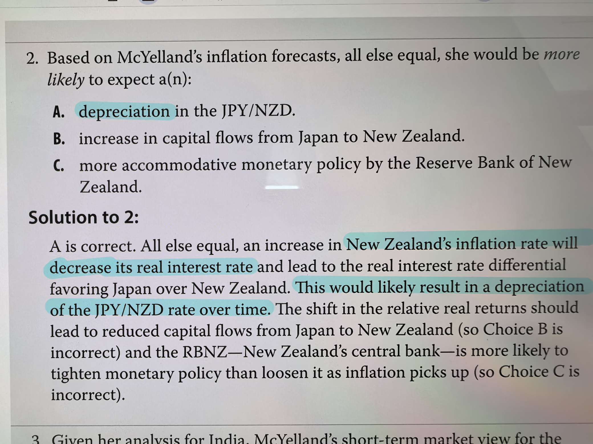 原版教程174页example3 新西兰通胀导致实际利率下降,按照carry trade理论,低利率low yield不是意味着forward premium吗?应该是新西兰元相对日元升值啊,为什么答案是贬值?