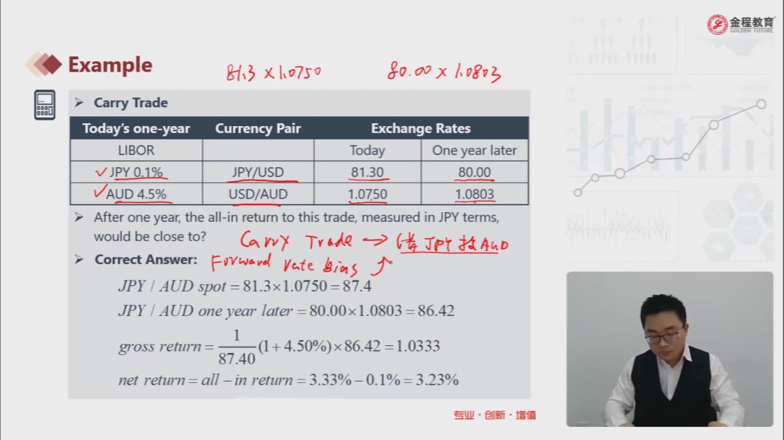 请问老师这里通过交叉汇率计算出spot rate=87.4,forward rate=86.42,那么未来AUD贴水discount,按照低买高卖的理论,应该借入AUD投资JPY,与使用carry