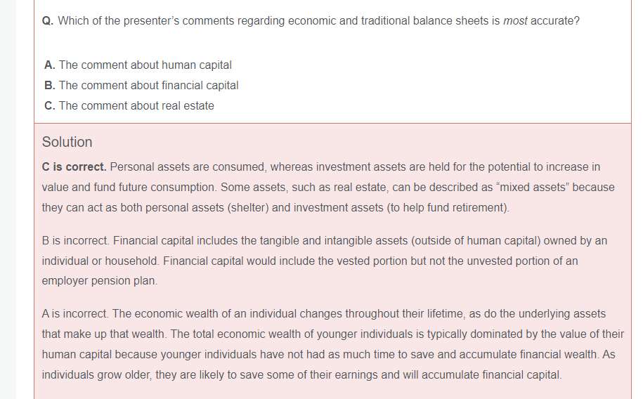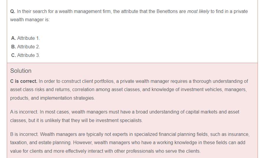 这题莫名其妙啊,不懂Capital market proficiency和Financial planning knowledge怎么做投资啊?而且proficiency in insurance and taxation是private wealth manager特有的吧?Portfolio construction ability, including detailed knowledge of asset class risk, return, and correlation不只是private, 所有的wealth manager都要会吧,跟private有啥关系?