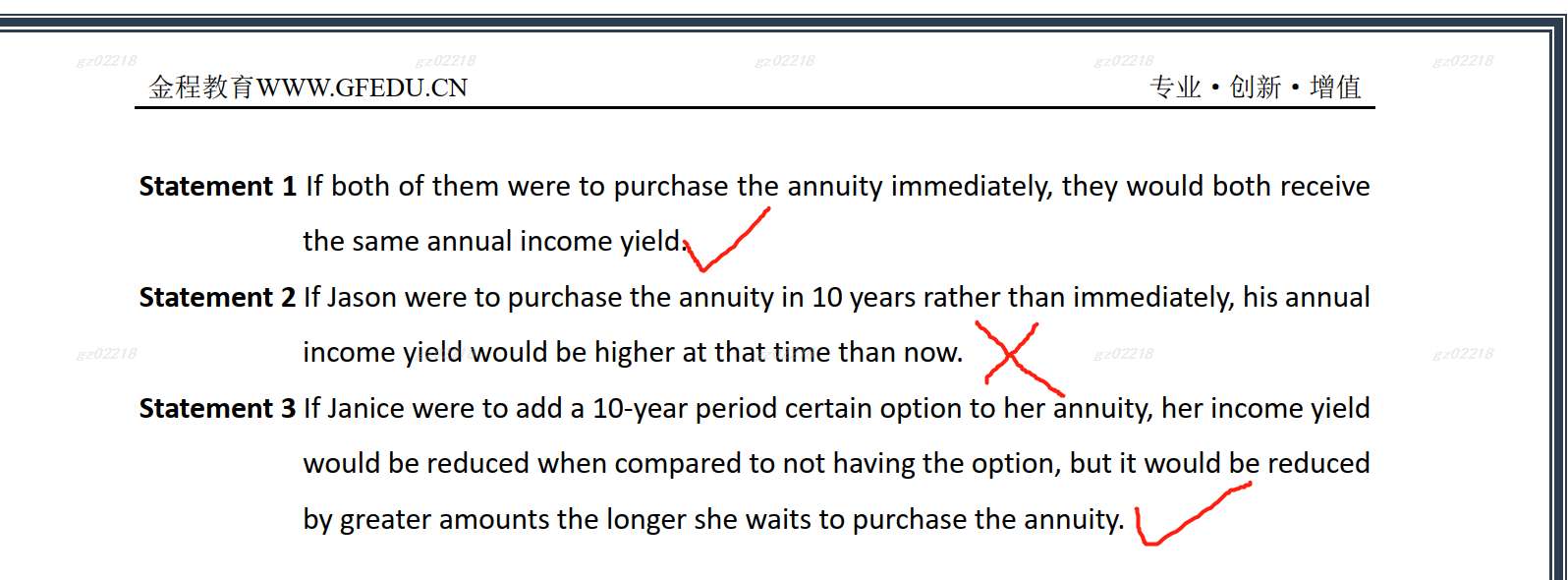 statement2为什么对呢,早买annuity不是income yield更高吗,为什么买的越晚反而越高?另外这个题的前提是它期初支付一次性费用,后续年领钱,还是每月支付保费,到一定年龄后每月领钱呢