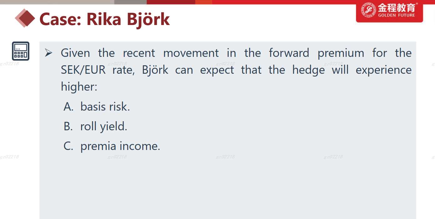 case Rita,这道题为啥不选basis risk呢,SEK收紧货币政策的话,SEK/EUR未来会上升,即F会增大,那么basis risk=S-F就会变小,不是该选basis risk吗,为什么选roll yield呢