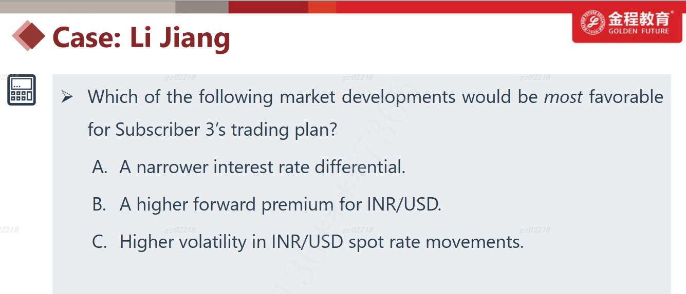 case Li Jiang这道题为什么选B呢,a higher forward premium for INR/USD的话,USD升值,期初借了USD换成INR,然后投资INR, 期末要讲INR换成USD时不时就亏了吗