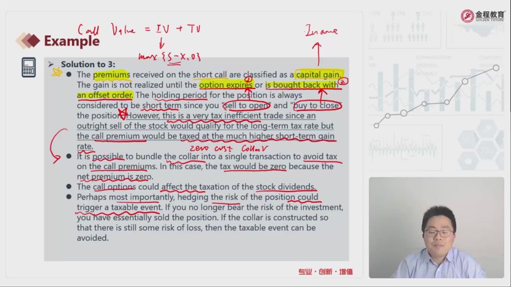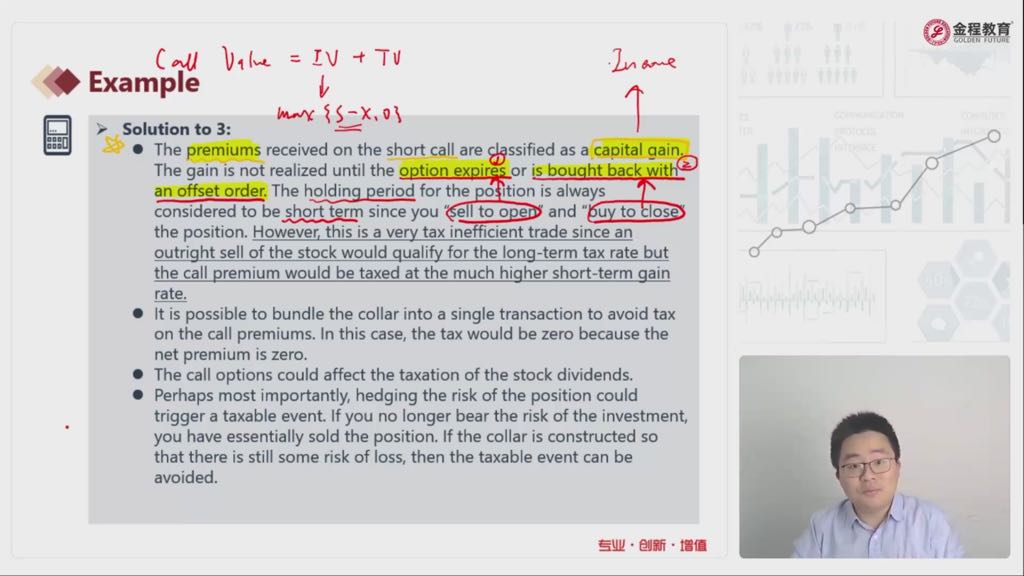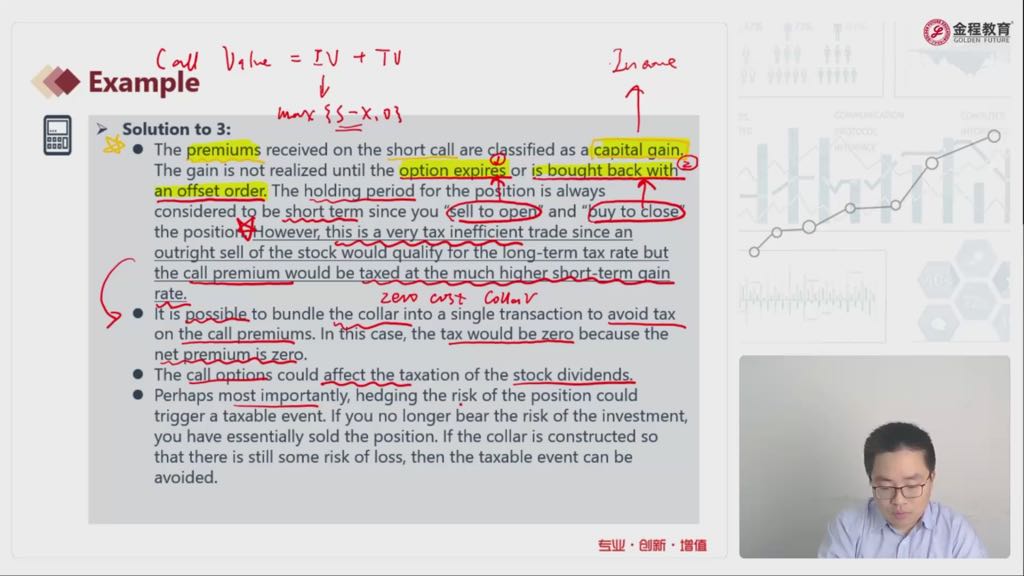 老师好,请问下例题中解析3的第一部分是不是表达covered call策略不是一个税收有效的策略,主要原因是在到期日之前一卖一买或者一买一卖已经实现capital gain?短时间产生的税率高?