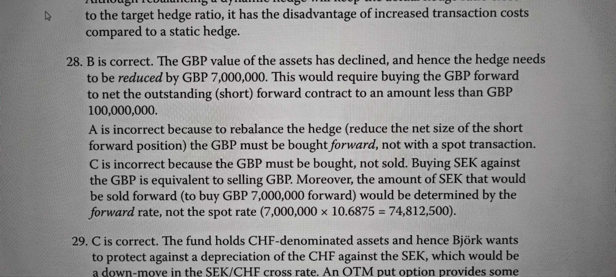 28题怎么看出来之前的position是net short forward? 这里还是没太明白,原1亿英镑的远期合约,现在英镑资产跌了7百万,所以现在买新的远期合约就要比原合同的减少7百万?