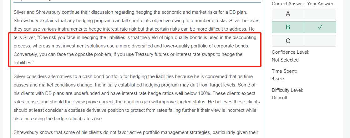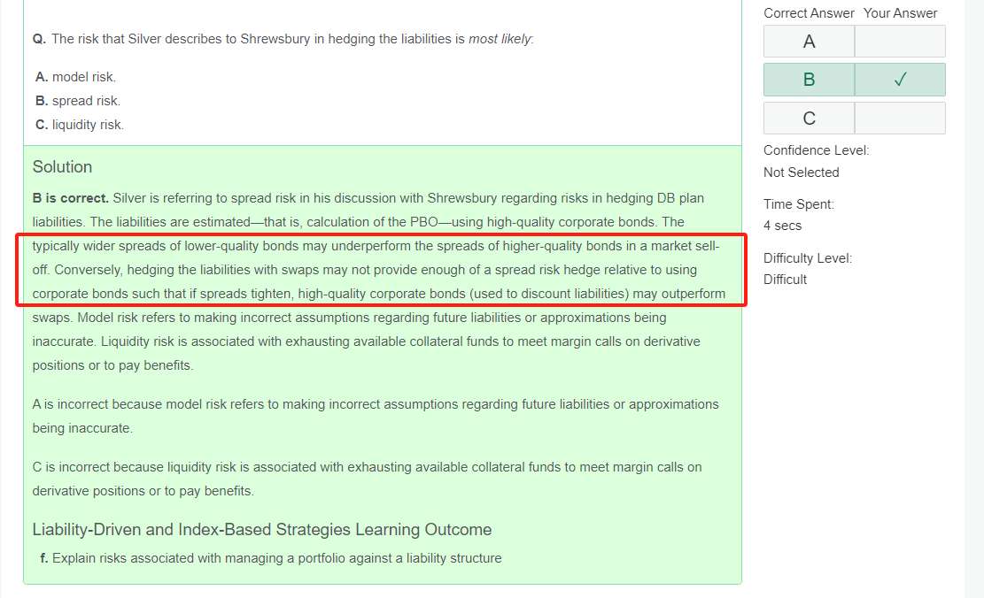 老师您好,这题我能理解说的是spread risk, 信用利差会考虑在折现率上。但是题干中提到的most investment solutions use a more diversified and lower-quality portfolio of corporate bonds.我不是很理解,如果spread很大,想要分散信用利差风险,为什么要用Lower-quality,不是应该用更好的评级的债券来减少信用利差吗?Conversely, you can face the opposite problem, if you use Treasury futures or interest rate swaps to hedge the liabilities. 这里说如果用国债期货或者IRS则会面对相反的问题,用国债期货和IRS就是没有credit spread了,这怎么还会有问题呢?答案中提到的The typically wider spreads of lower-quality bonds may underperform the spreads of higher-quality bonds in a market sell-off. Conversely, hedging the liabilities with swaps may not provide enough of a spread risk hedge relative to using corporate bonds such that if spreads tighten, high-quality corporate bonds (used to discount liabilities) may outperform swaps. 这里说在sell-off的时候,wider spreads表现比较差,是指wider spreads bonds的价格低于Higher spread bonds嘛?为什么用swap对冲不够,但是用公司债对冲反而更好呢?公司债的信用利差不是应该会更大吗?