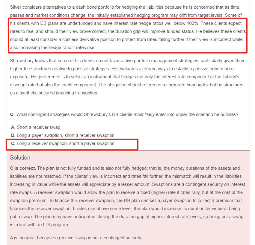 老师您好,这题的题干要求protect from rates falling further if their view is incorrect while also increasing the hedge ratio if rates rise. 也就是说在利率上升的时候提高hedge ratio,在利率下降的时候想让asset少下降一些。我理解利率下降的时候,债券价格上涨,本身处于underfund的状态是希望资产的价格上涨更多的,那么就要增加duration,此时需要receive fixed, 但是答案却说 A receiver swaption would allow the plan to receive a fixed (higher) rate if rates rally,即利率回升的时候要收fixed,和我理解的利率下降要receive fixed相悖,是我哪里理解错了?另外我理解,利率上升时市场上的参与者都是想要收浮动支固定;利率下降时市场上的参与者都是想要收固定支浮动。那么希望利率不管上升下降时候都有利(即要么protect要么increasing the hedge ratio),不应该都买swaption吗?虽然题干也提到想要costless,但感觉sell option不行诶