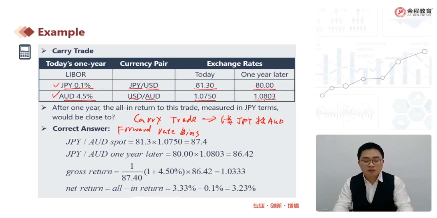 我看了助教回复其他同学的问题时有提到,“但如果是carry trade(借低利率投资高利率)时,不会使用forward来签订合约(而是等到期,直接在spot市场换汇),因为一旦使用forward,那么投资外币再换回本币,收益就是国内的无风险收益(covered IRP一定会成立)。”这句话麻烦能再解释一下吗?为什么carry trade不能使用forward,而做汇率套利的时候就得使用forward,不是说用forward covered IPR一定会成立吗?