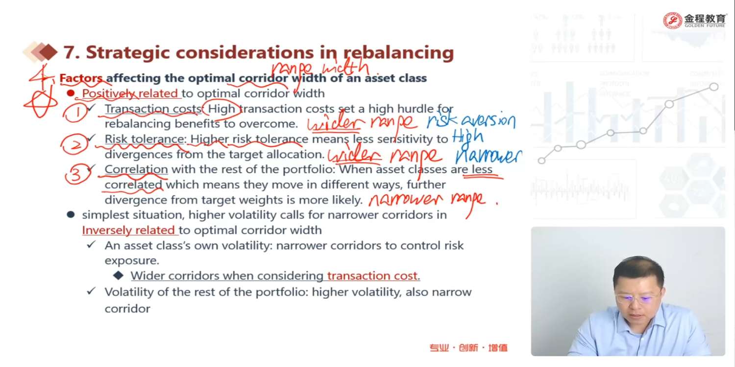 这里关于correlation的解释存在confusion,就是当资产之间less correlated, narrower range,但是当资产之间是-1,那么其实相关性很强,但是是负相关,这个时候也是narrower range。这个就是例外了。