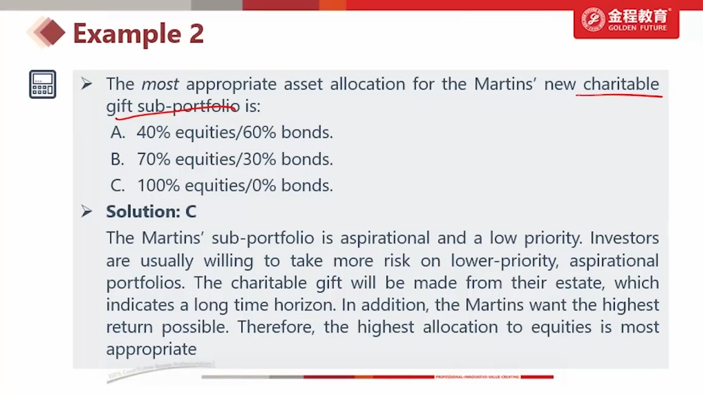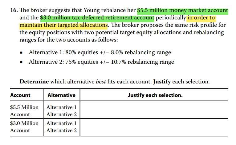 三级 AA $5.5 Million Account是net of tax,net of tax是说明这个账户就是taxable account了吗? 如果货币基金账户是taxable account,那我也可以理解为taxable account 对equity这类low tax资产比较适合,我多配制一些equity更好,那么$5.5 Million Account选择Alternative 1: 80% equities也讲得通吧? 这类题目怎么权衡equity权重更大一些重要? 另外,taxable account内资产波动小我可以理解,但是为什么韩霄说资产波动率降低,故可推导出其rebalancing range更大?不make sense吧