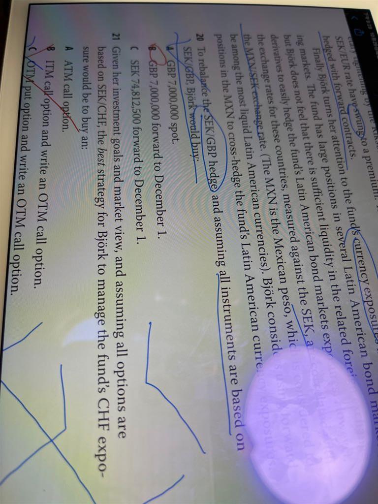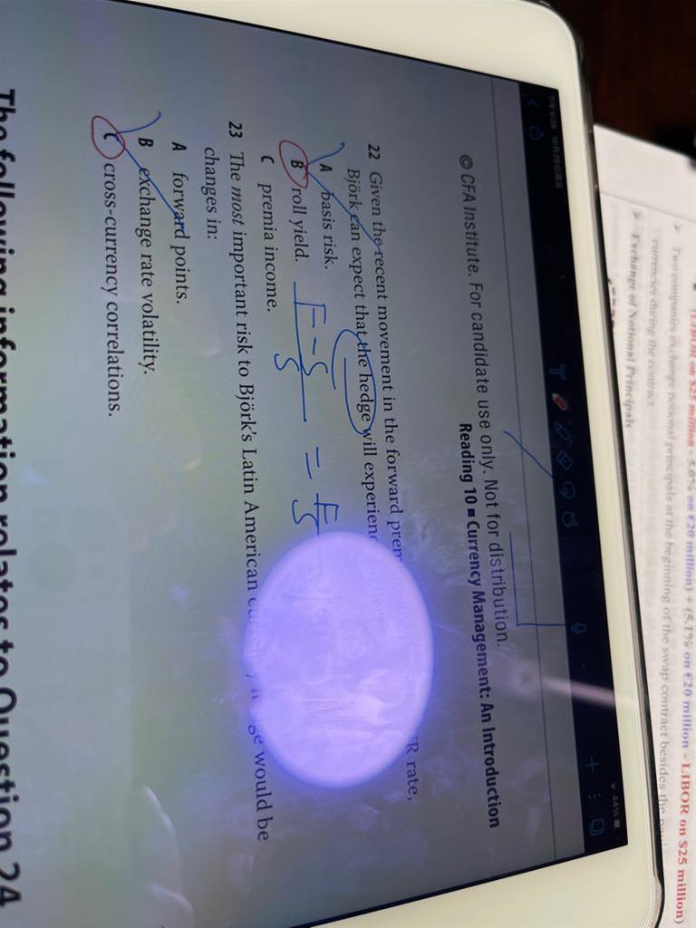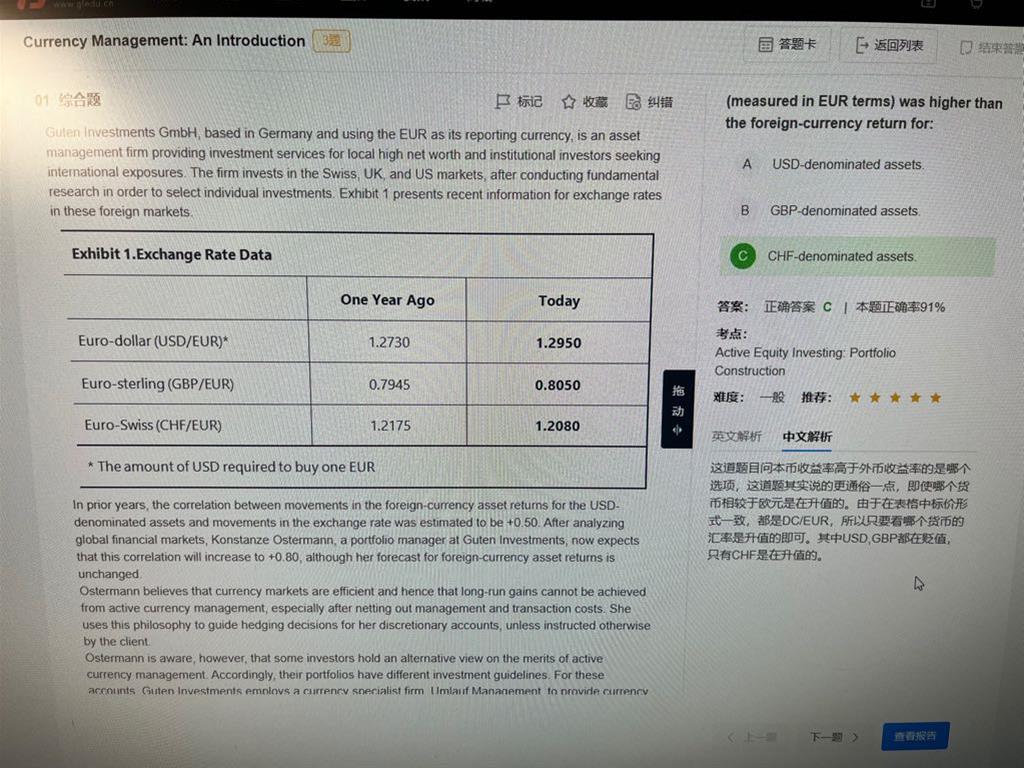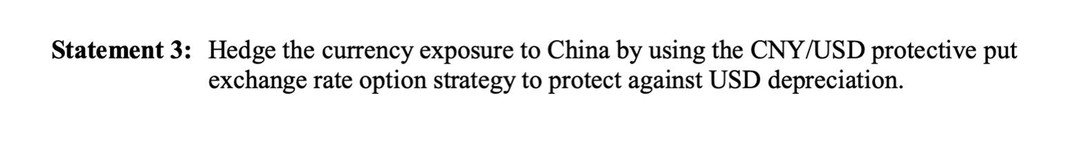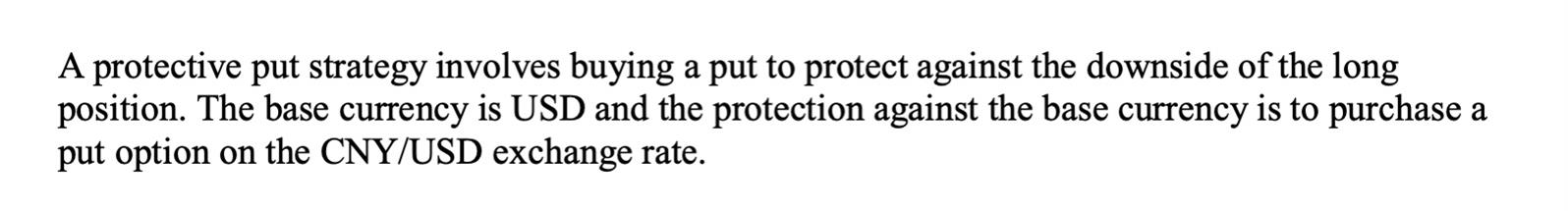 这句话我觉得是错的,但答案说是对的,我觉得有问题。本币是USD,持有CNY资产,应该是担心USD升值或者CNY贬值,没必要“protect against USD depreciation”。所以这里如果非要用CNY/USD put也得是sell the put。答案明显不对,官网下载来的模拟题。