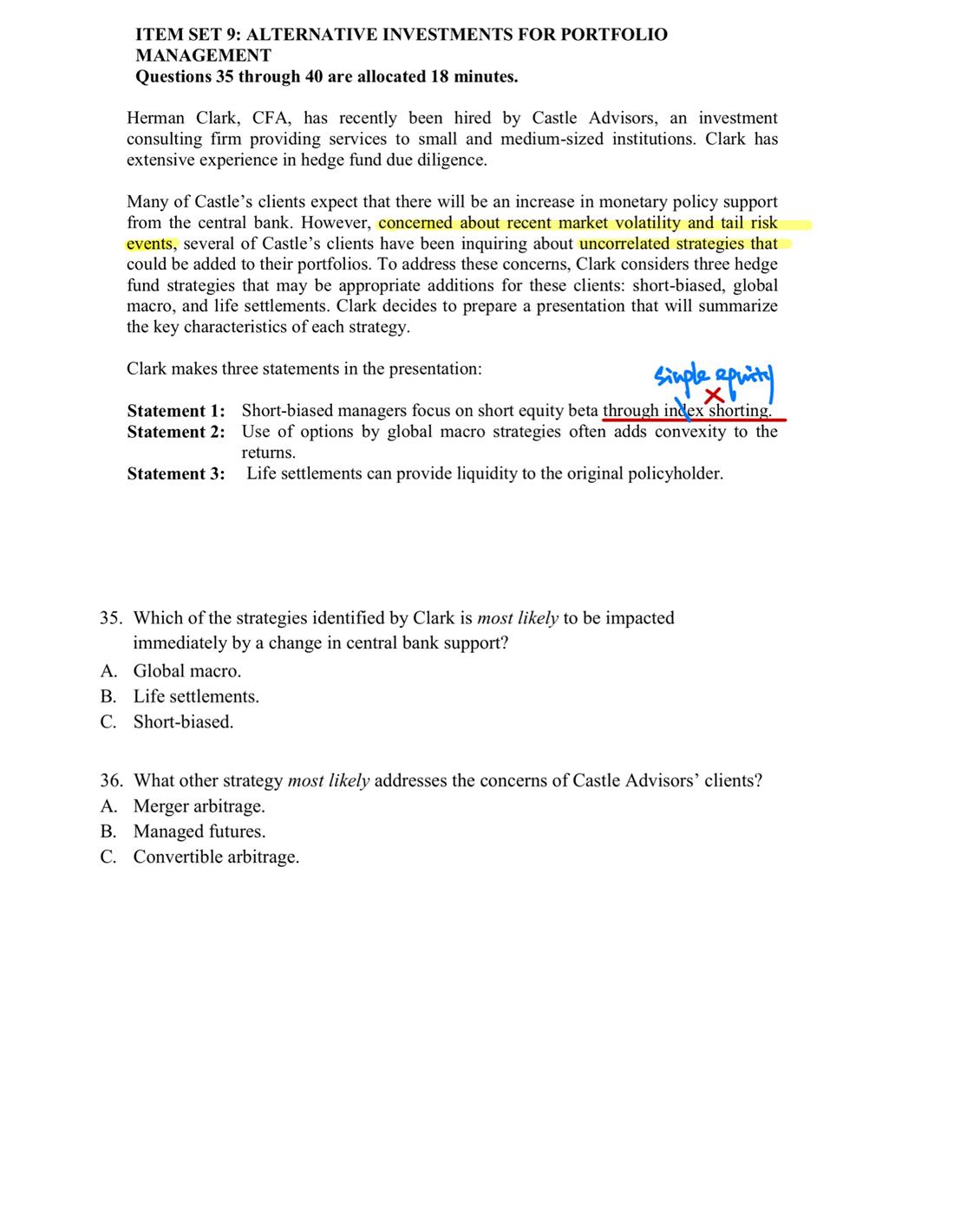 已回答老师好, 附件是三级模考第二套35、36题,都是另类投资的题目。 35)为什么global macro strategy不对?是因为不是immediate impact吗? 36)为什么merged arbitrage不对呢?这个策略应该跟capital market相关性不大啊,不是取决于并购是否成功吗?这跟equity market, bond market有啥相关性? 谢谢。